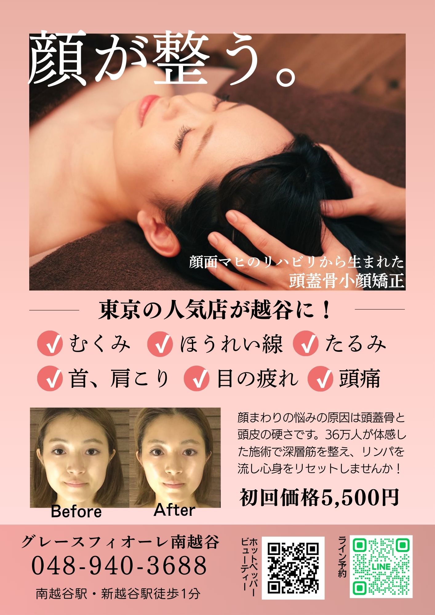 新越谷・南越谷1分◆頭蓋骨小顔矯正×リンパ流しで、たるみ/むくみ/左右差/エラ/首肩こりを改善!
