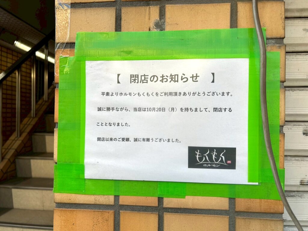 2025年10月20日、北越谷にあるホルモン焼肉もくもくが閉店しました。