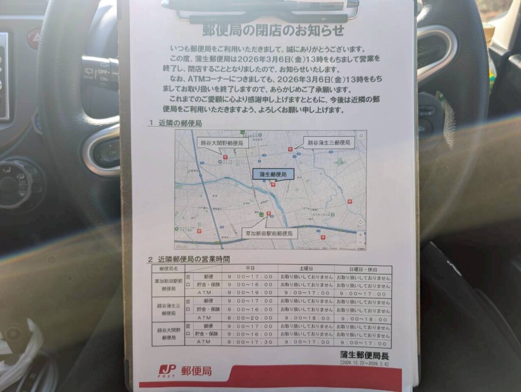 局内の方にお話を聞いたところ、閉店のお知らせという資料を頂きました。3月6日の13時に、ATMも含めて閉店してしまうそうです。お近くの郵便局は、草加新田駅前郵便局・越谷蒲生三郵便局・越谷大間野郵便局となります。お近くにお住まいの方、3月6日以降の郵便局のご利用にはご注意ください。