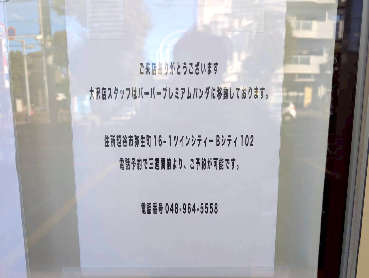 パンダ理容室大沢店は経営統合により閉店という壁紙が出ていました。スタッフの方々は、ツインシティ内のバーバープレミアムパンダに移動となったようです。近隣には、赤山店・花田店・イースト店(東越谷)などのお店がございます。パンダ理容室をご利用の方は、こちらのお店にアクセスしてみてください。