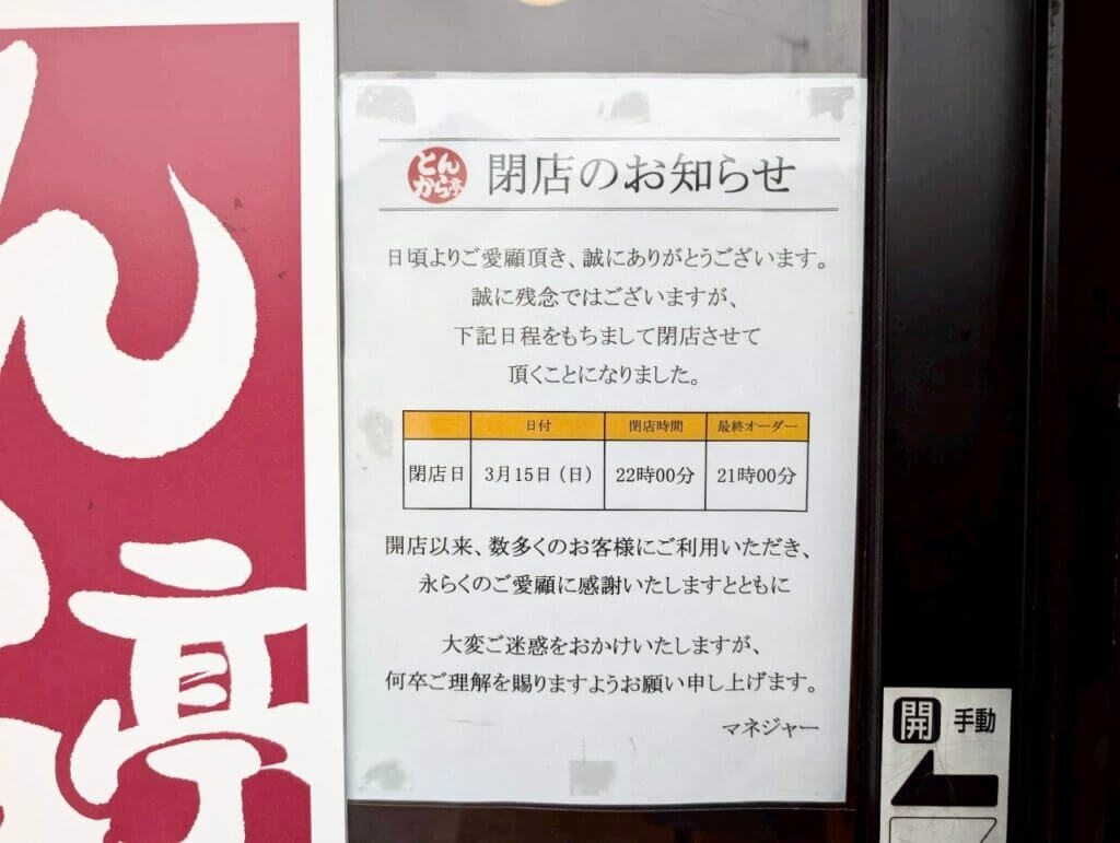 店頭には閉店のお知らせが掲示されており、閉店当日は21:00最終オーダー、22:00閉店と案内されています。「とんから亭」はすかいらーくグループの店舗で、とんかつやから揚げを中心に、蕎麦や丼ものなどを提供。カレーかけ放題の無料サービスがあるのも特徴として知られています。 お手頃に揚げ物や蕎麦を楽しめたお店だけに、閉店を残念に感じる方も多そうです。
