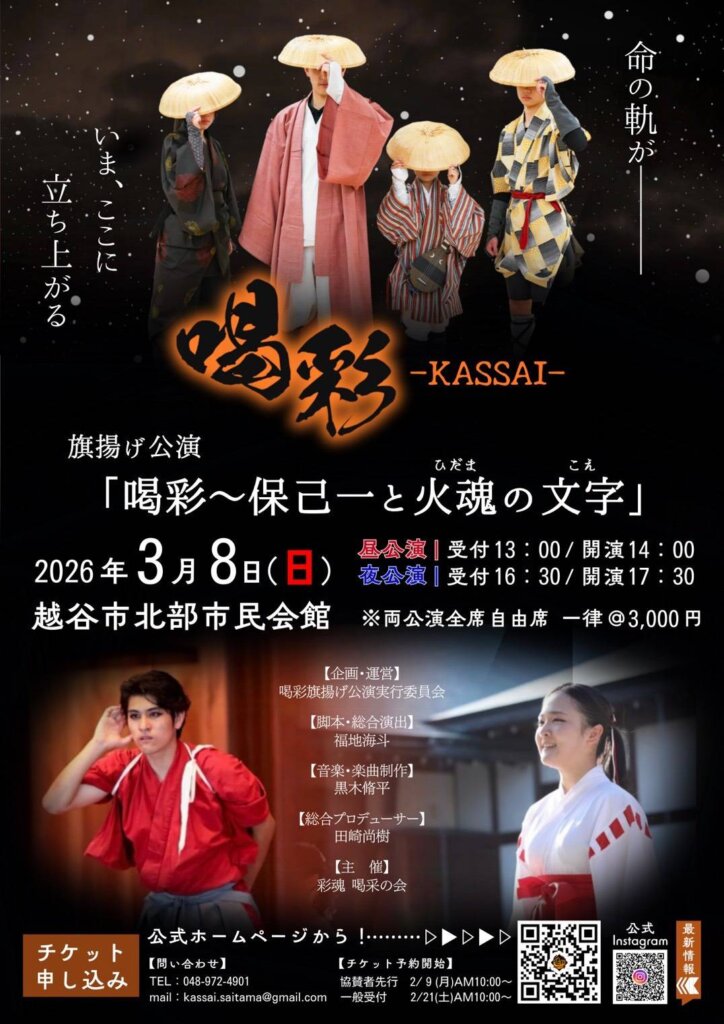 越谷市を拠点に小学生~高校生までのメンバーで活動する「チーム喝彩」は、来る2026年3月8日(日)、越谷市北部市民会館にて、旗揚げ公演『喝彩~保己一と火魂の文字(ひだまのこえ)~』を上演いたします。