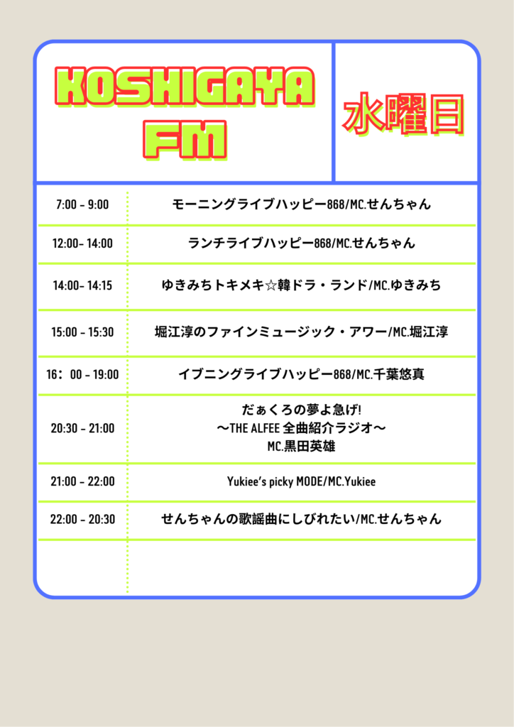 【水曜日】ハローハッピー868こしがやエフエムFM番組表【こしがやエフエム】