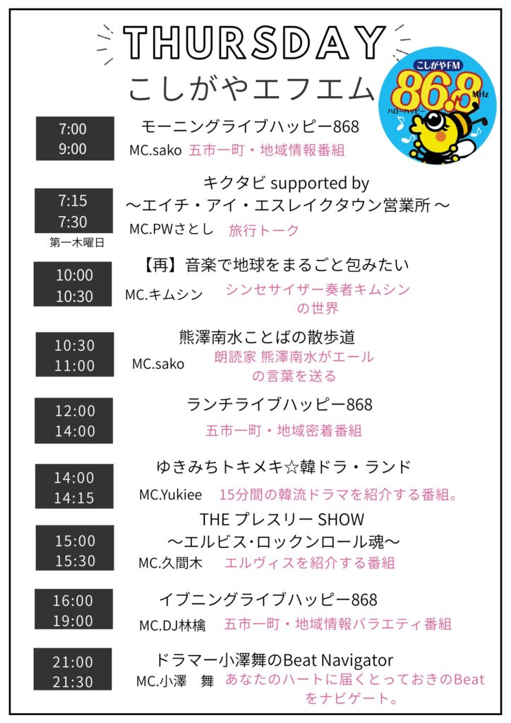 【木曜日】ハローハッピー868こしがやエフエムFM番組表【こしがやエフエム】
