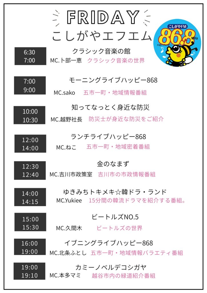 ホーム » こしがやエフエム » 【金曜日】ハローハッピー868こしがやエフエムFM番組表【こしがやエフエム】