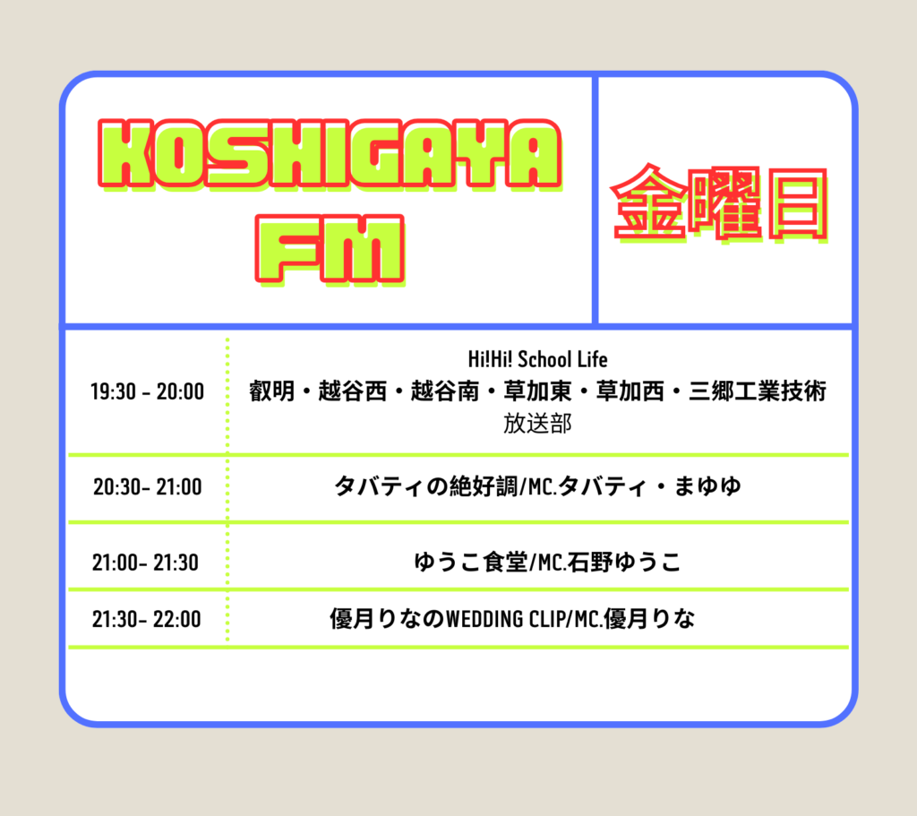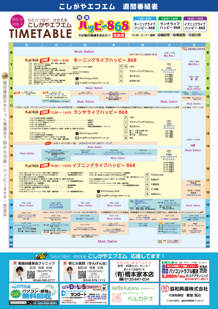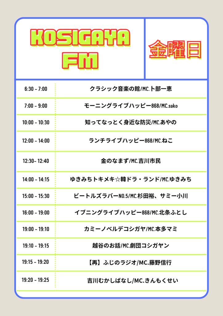 ホーム » こしがやエフエム » 【金曜日】ハローハッピー868こしがやエフエムFM番組表【こしがやエフエム】
