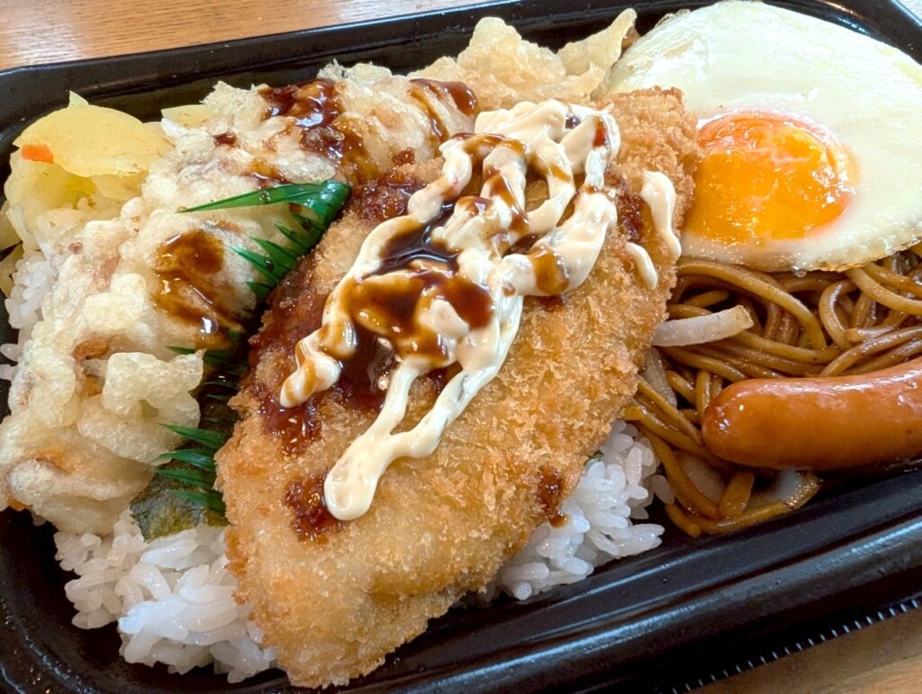 こちらがBIGのりタル弁当(ソース焼きスパ)です。人気ののり弁をベースとした期間限定のメニューになっています。魚のフライ・ちくわ揚げ・ソーセージ・目玉焼き・漬物と、のり弁の定番を崩さない王道のおかずが、海苔ご飯とソース焼きそばの上に乗っかっています。このお弁当、とにかく濃厚です。フライに揚げ物、ソーセージ、濃厚なソース焼きそばが重厚感を演出しています。海苔ご飯と漬物は、この弁当の良心です。おかずを相互補完しつつ、全体のバランスを保ってくれています。食べれば食べるほど箸が進むお弁当でした。