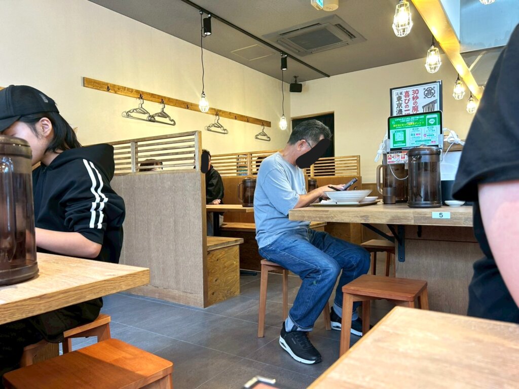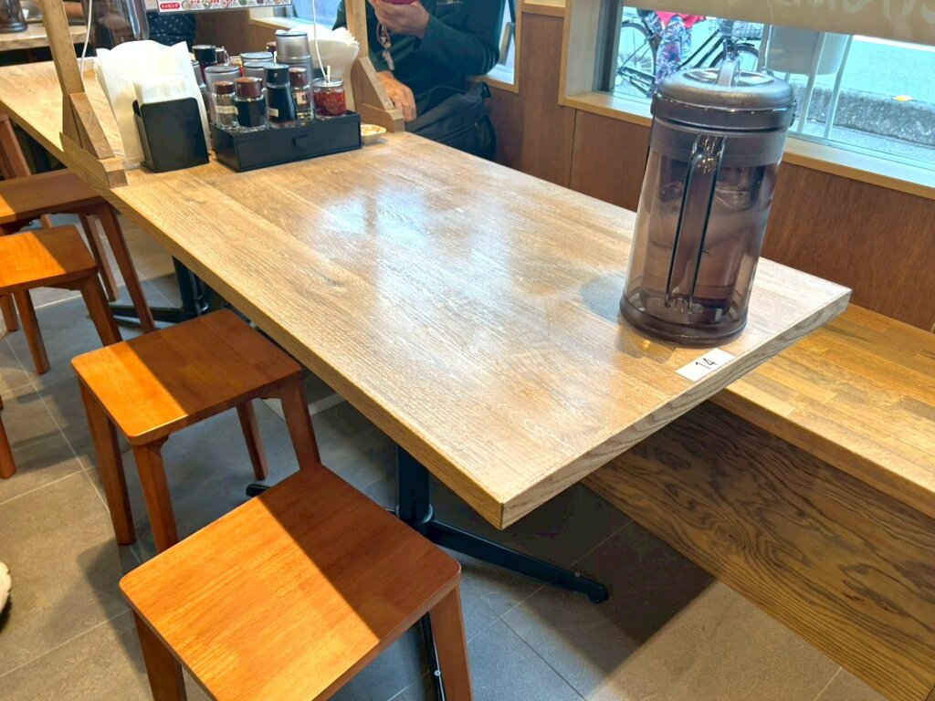 店内はカウンター席とテーブル席で構成されています。カウンター席は9席、テーブル席は32席あります。お冷はセルフサービスで、テーブルに置かれています。卓上調味料にはちゃんぽんに合うものが揃えられています。