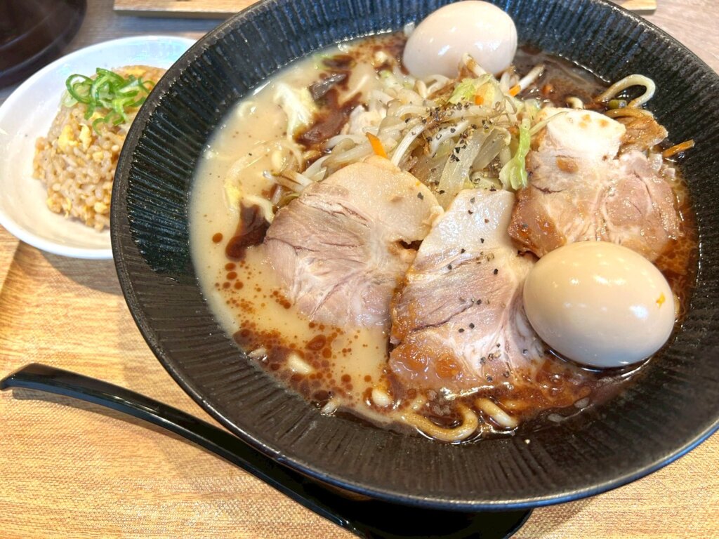 こちらが濃厚焦がしにんにくちゃんぽん半チャーハンセットです。ボリューム感のあるちゃんぽんと小さめの半チャーハンがついています。お得なクーポンによって味付けたまごをひとつ追加することが出来ました。