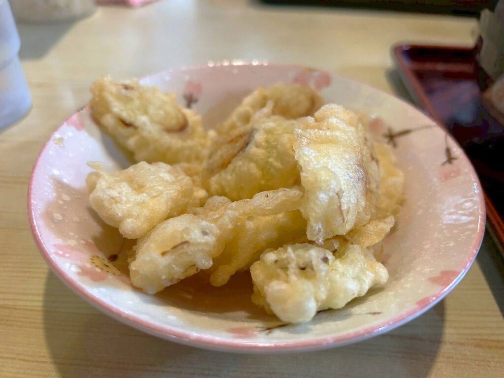 こちらは単品で注文したネギ天ぷらです。天つゆと塩でいただくことが出来ます。筋がないとても柔らかいネギは、甘く塩との相性が抜群です。ボリューム感があり、一皿の中にたくさん入っていました。