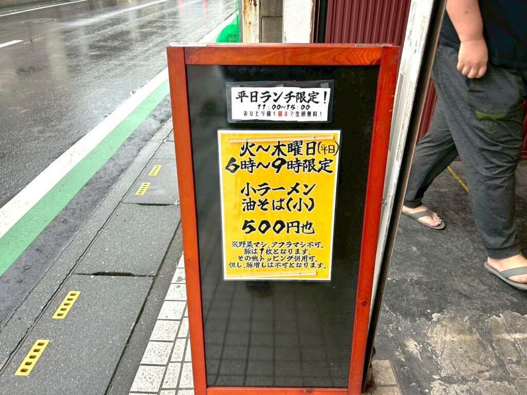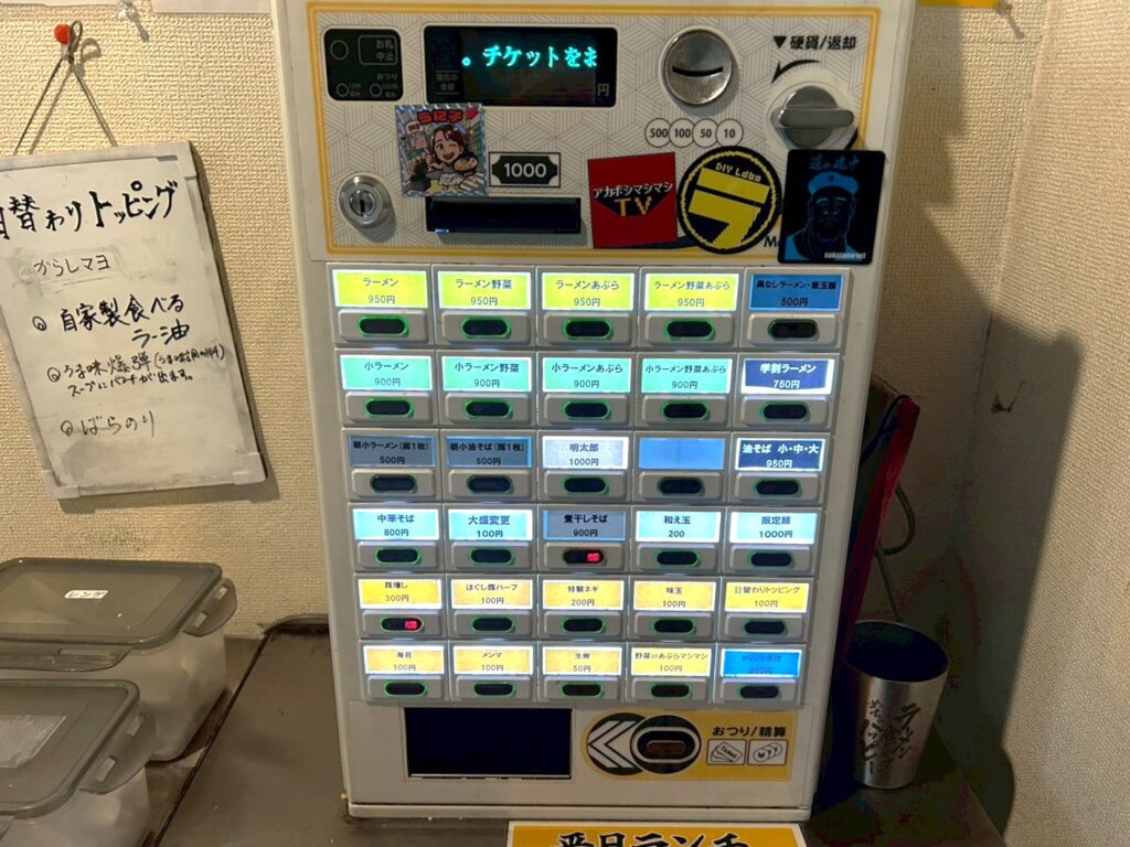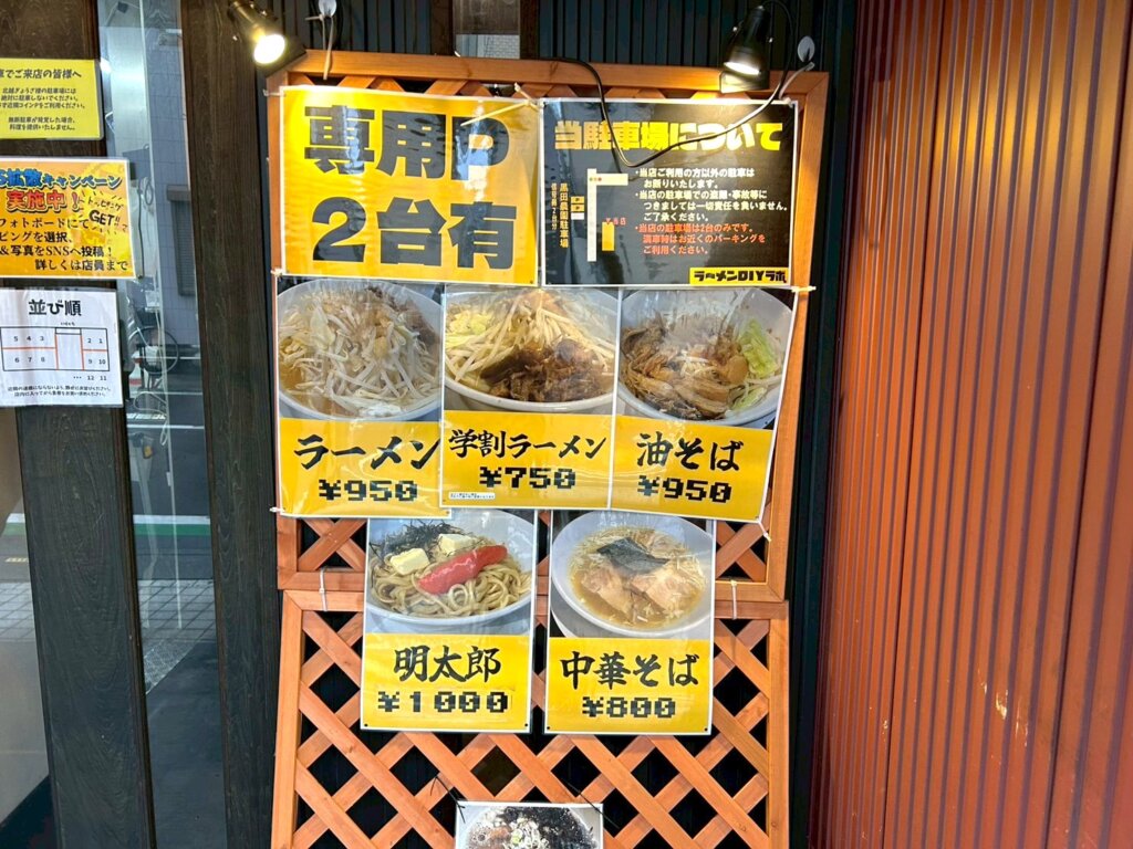 注文は食券制です。メニューは二郎インスパイアから中華そばまで幅広く展開されています。ラーメンには野菜やあぶらといったメニューもありました。明太郎という気になるメニューもあり、さらにランチには生卵がサービスという特典もあります。