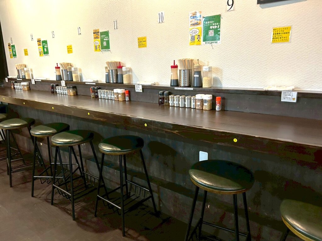 店内はカウンター席のみで構成されています。カウンター席は15席あり、黒と濃い茶色を基調とした落ち着きのある広々空間になっています。