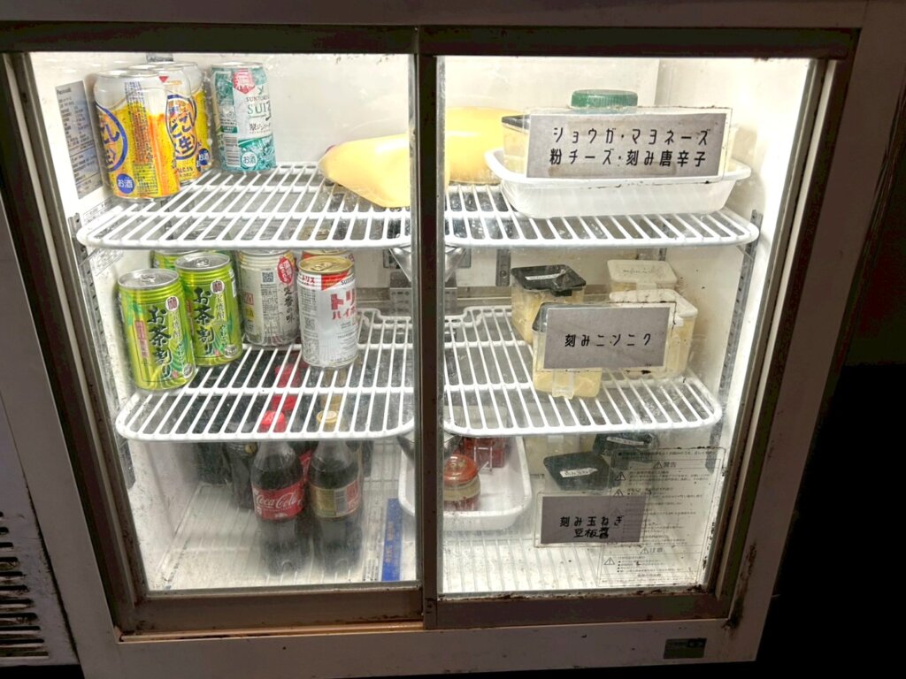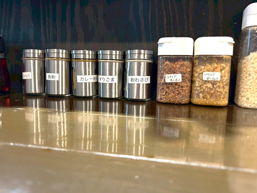 卓上と食券機の下にカスタマイズ用のトッピングが配置されています。刻みニンニクや魚粉などの王道ものから、カレー粉や粉わさびなどといったあまり見ることのないトッピングまで準備されています。