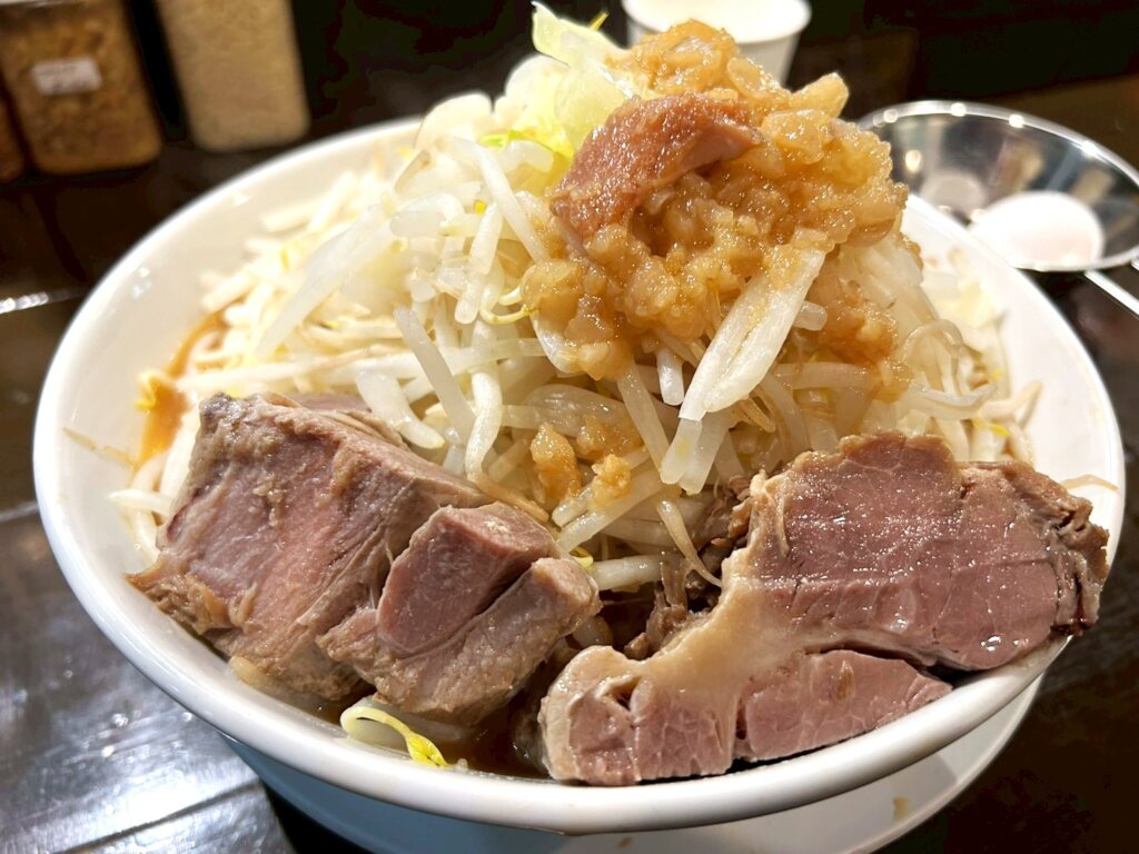 こちらがラーメン野菜あぶらです。背脂とたっぷりの野菜が乗っています。ゴロっとしたチャーシューは柔らかく、口の中でホロホロと溶けていきます。刻みニンニクと黒コショウをトッピングさせていただきました。ワシワシ太麺は食べ応えがあり、濃厚なスープと脂は王道の二郎インスパイアを感じさせてくれます。