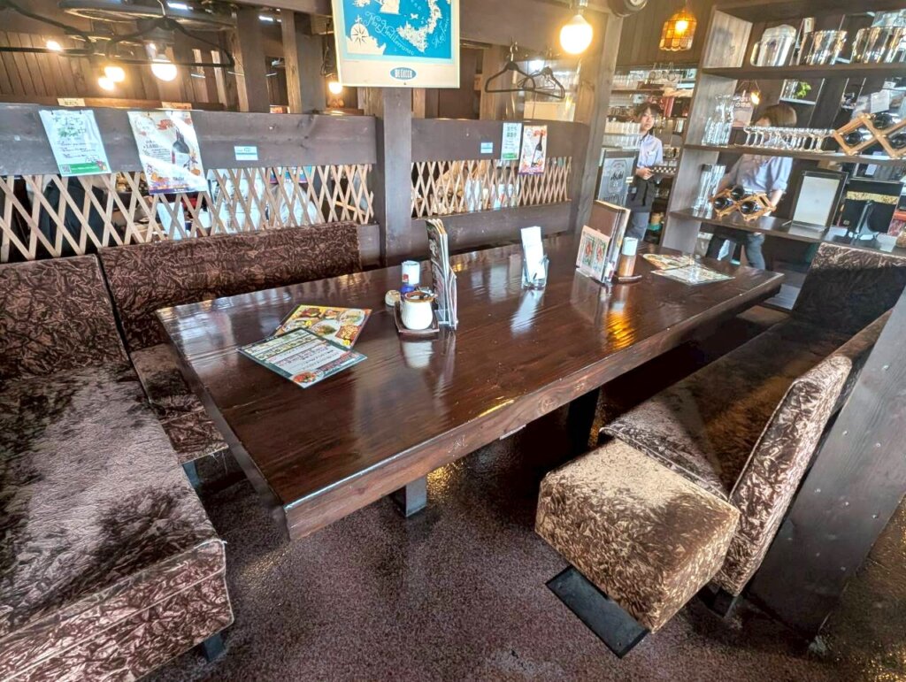 店内はテーブル席で構成された、広々空間となっています。温かみのある木の空間は、なつかしさを感じさせてくれました。テーブル席と通路の間には敷居があり、半個室のような感覚でゆったりと食事を楽しむことが出来そうです。