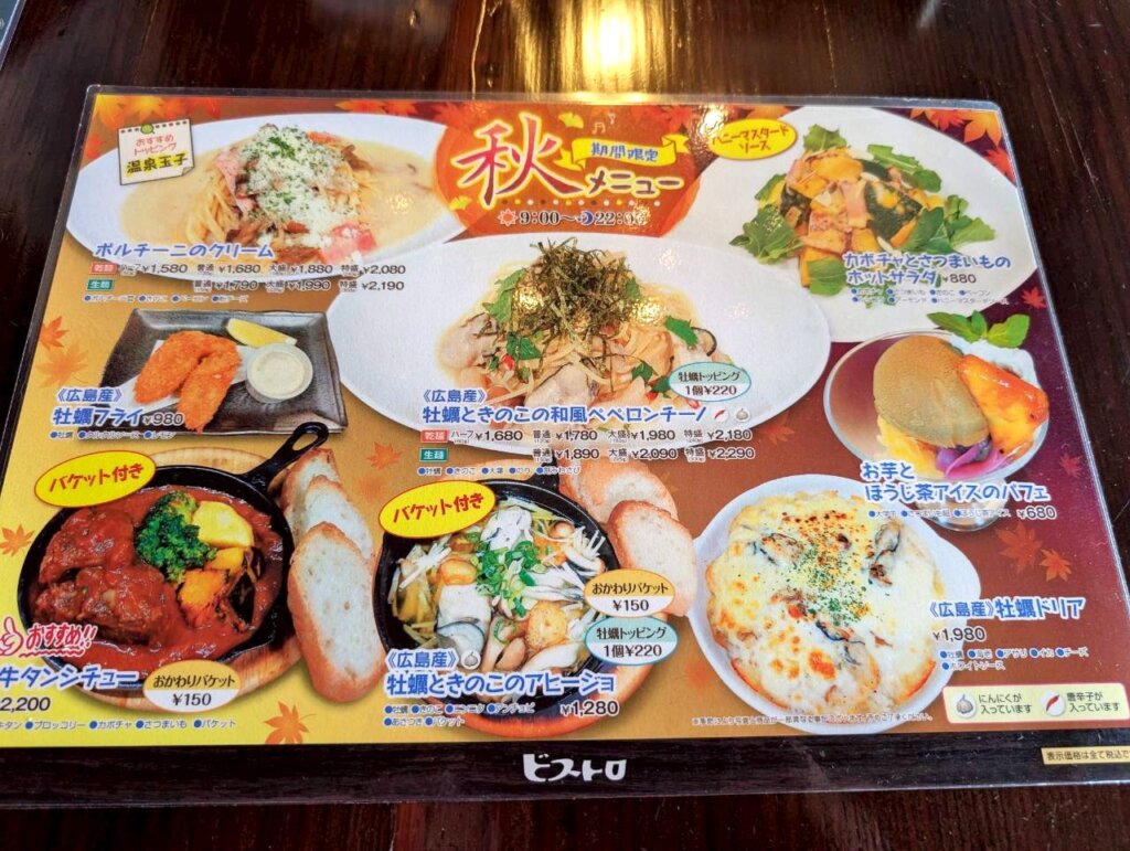 季節限定の秋メニューが展開されています。おすすめのパスタやシチューなどに秋の味覚がふんだんに使用されているとのこと。ランチメニューも豊富に展開されていて、お得な選べるセットも用意されていました。