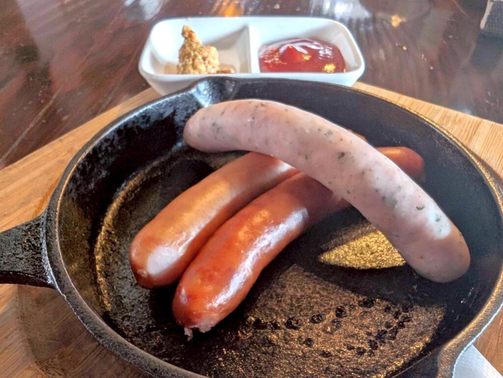 ソーセージ3種盛りは、ひと口噛むと口の中で旨みが弾けます。旨みを逃がさずにパリッパリに焼き上げるその工夫には、感謝状を贈りたくなります。ソーセージ好きにはたまらない一皿でした。