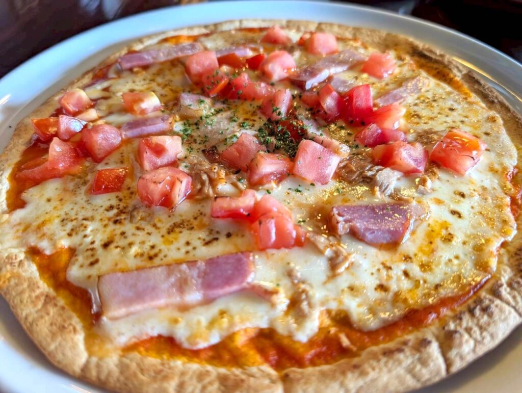 こちらはミックスピザです。生地がサックサクですッ。トマトソース・チーズ・ベーコン・トマトといったそれぞれのトッピングの特長がしっかりと表れています。濃厚ですが、生地が比較的薄めなので、食べやすい一枚でした。