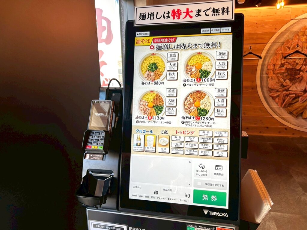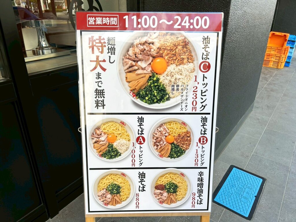 メニューは油そばと辛味噌油そばの2種類で構成されています。乗ってくるトッピングによって分けられていました。麺の量は特大まで無料とのことでした。追い飯やトッピングなども多くありました。