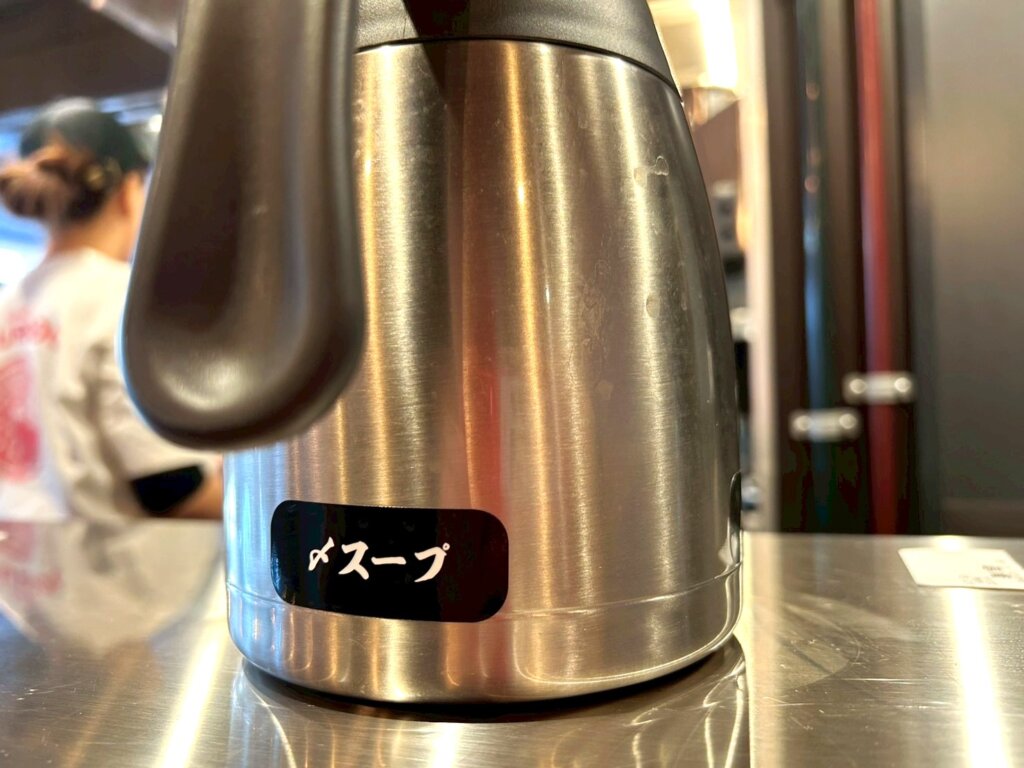 追い飯もいただきます。食券を購入した後、自分の好きなタイミングでいただくことが出来ます。少し麺と油を残してご飯を入れます。カウンター上にある〆スープを足すことでお茶漬けのように食べることが出来るのが魅力です。中華スープなので濃い目の一杯をいただくことが出来ました。魚粉を少し加えることで、つけ麺のスープにご飯を入れていただくような雰囲気で完食することが出来ました。