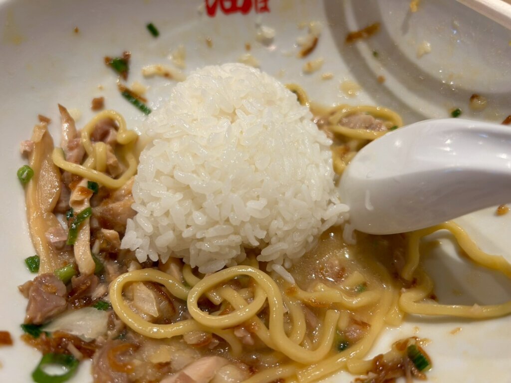 しっかりと油が絡むように麺を混ぜていきます。トッピングもしんなりとしていき、麺に良く絡みついていきました。しっとりとした上品な味わいでした。ニンニクと玉ねぎ、カエシを加えることによってパンチの効いた味わいに変わっていきます。10種類以上の卓上調味料を足すことによって、何十通りの味わいを楽しむことが出来ました。