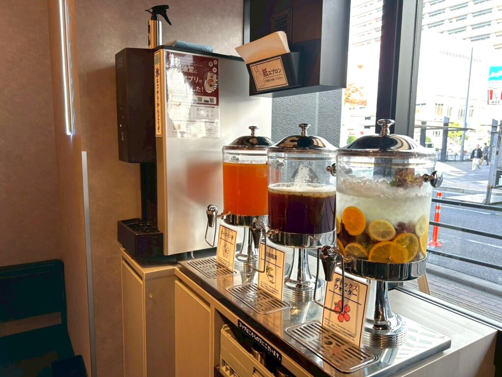 店内はカウンター席のみで構成されています。前後にスライドするタイプの座席になっているのでゆとりがありゆっくりと食事を楽しむことが出来ます。セルフサービスで、お冷以外にもジャスミン茶・黒ウーロン茶・デトックスウォーターを飲むことが出来ます。健康に気を使っていても油そばを楽しむことが出来るように配慮されていました。