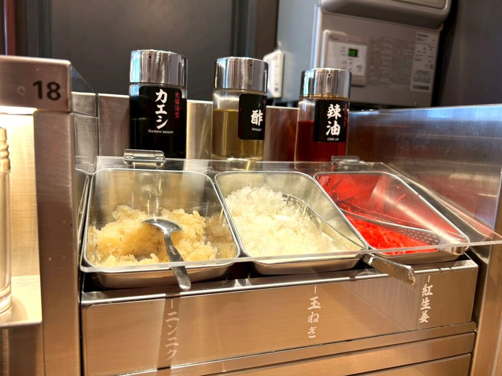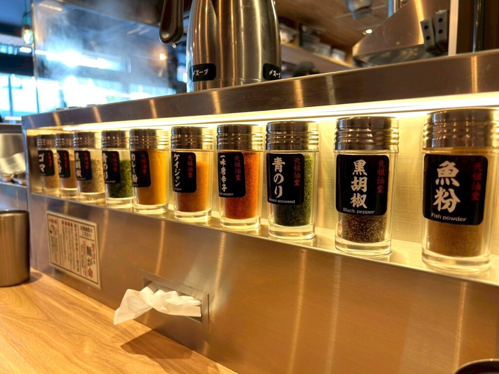 テーブルはスタイリッシュな雰囲気があります。油そばに必要な卓上調味料のお酢・ラー油はしっかりと準備されていました。それ以外にもカエシやにんにく、玉ねぎなども置かれていました。10種類以上の卓上調味料で自分好みの味にカスタマイズすることが出来ます。