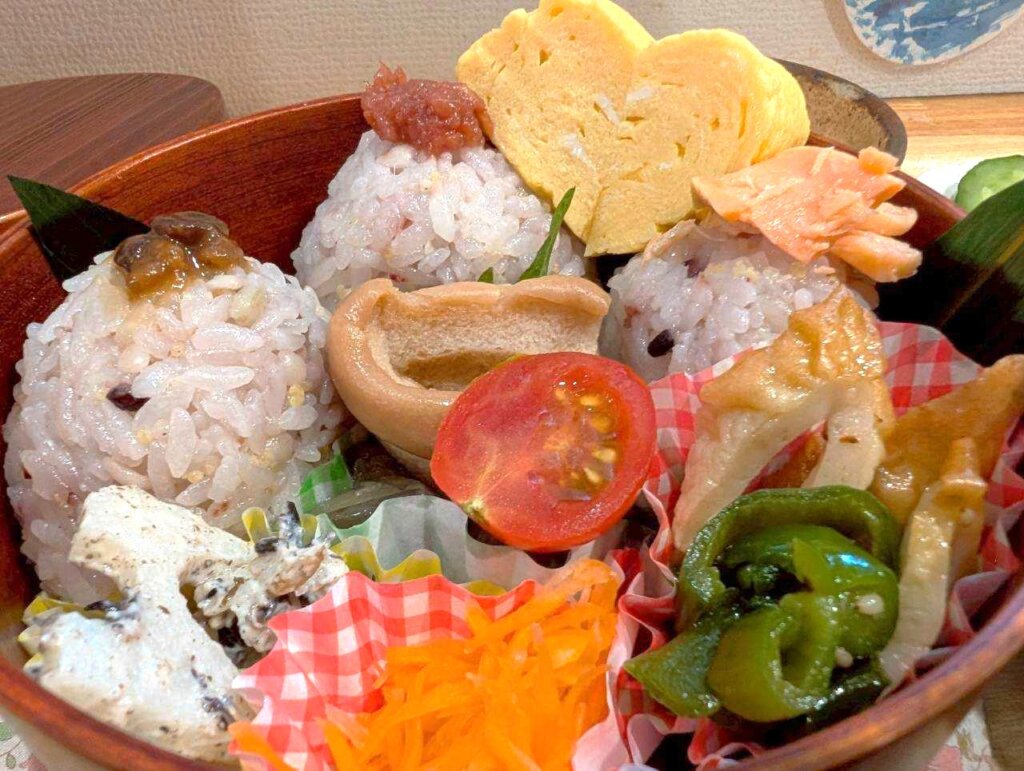 こちらが、えみまるさんのおむすびランチです。雑穀入りのおむすびと発酵調味料を使用したおかず、お味噌汁を楽しむことが出来ます。お味噌汁とおむすびという普遍性ときれいな食事バランス、全体的にどこまでも優しい味わいが特徴的でした。