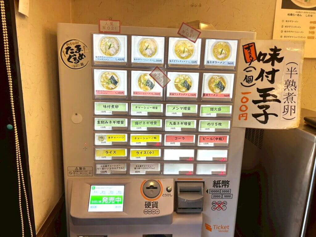 注文は食券制です。メニューはラーメンとワンタンメンで構成されています。初めての方が注文しやすいように、人気メニューには記載があります。トッピングやライスも充実。大きな文字で味付玉子の文字が。おすすめのようです。
