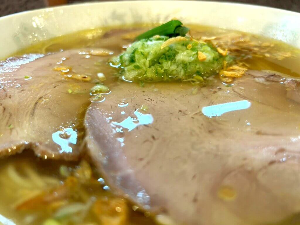こちらが塩ネギチャーシューメンです。トッピングは、チャーシュー・揚げネギ・ネギ・メンマが乗っています。大きめのチャーシューは3枚乗っていて、お得感が満載です。香ばしいスープは食欲をそそります。