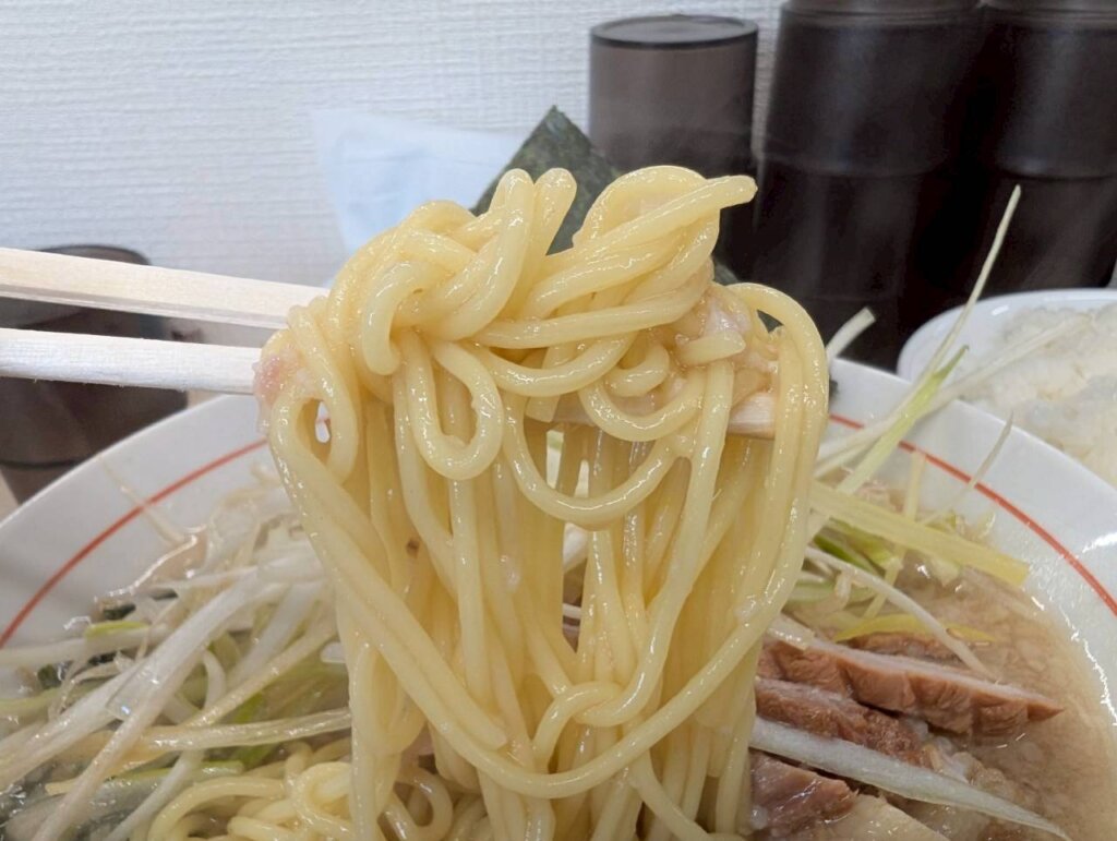 トッピングには、白髪ネギ・チャーシュー・わかめ・メンマ・のりが乗っています。ネギとチャーシューの旨味がスープに溶け出しており、味わいは立体的でコクを感じます。しっかりとした濃厚なスープは背脂・麺との相性が抜群です。