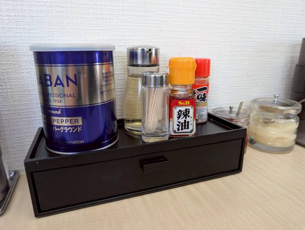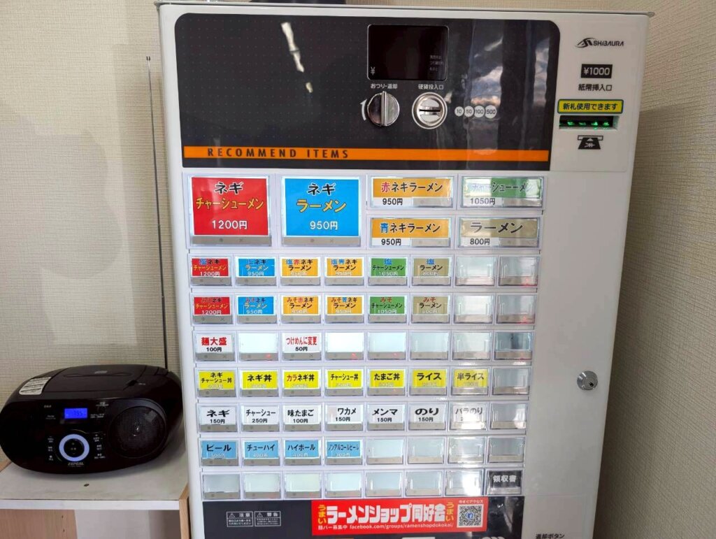 注文は食券制です。ラーメンショップなのでネギラーメンを中心にメニューが展開されています。丼ものメニューが豊富なのも特徴の一つです。赤ネギラーメンや青ネギラーメンというメニューもありました。卓上にはコショウやお酢だけではなく、ニンニクまで置いてあります。