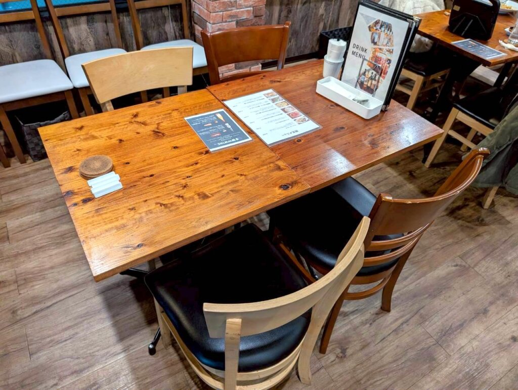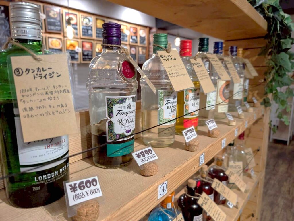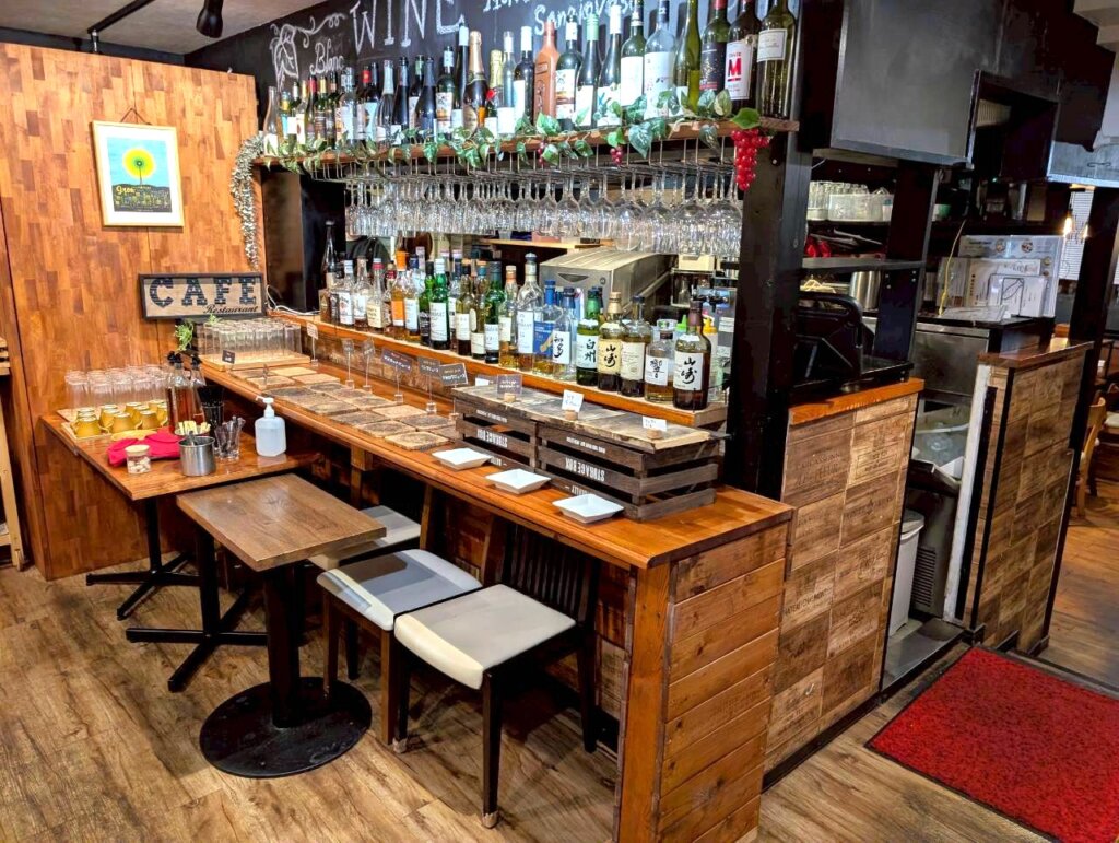 店内は広々としていて、木目調のテーブルなどで構成されています。シックな空間の中に、色とりどりのお酒の瓶や小さめの雑貨が配置されていて、まるで西洋のレストランを思わせる作りになっていました。お昼とは印象が違う空間の中で、お客さんがお酒を楽しんでいたのが印象的でした。