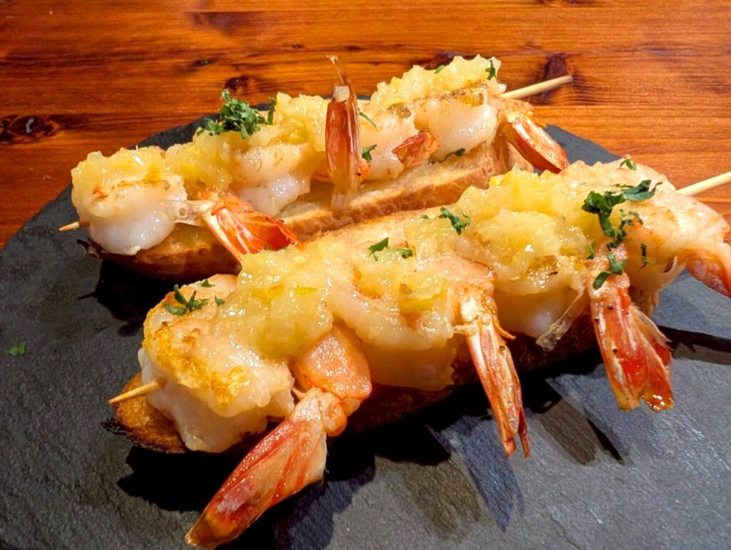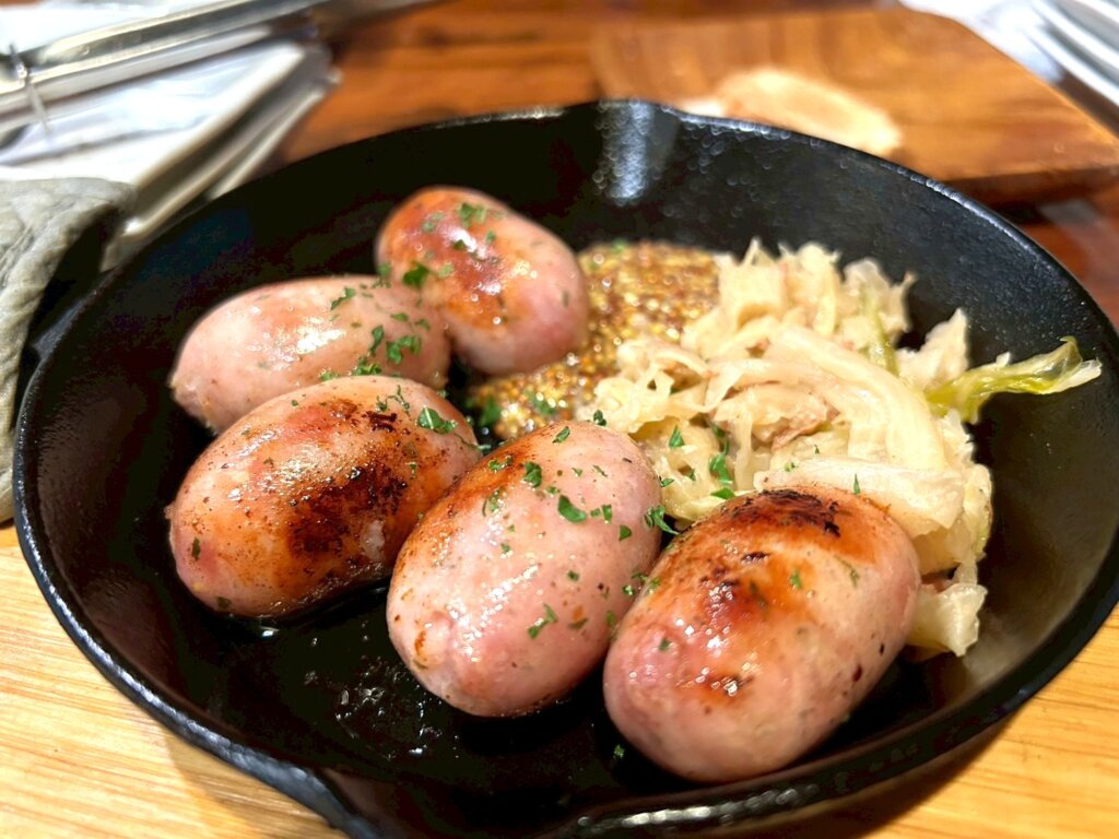 せっかくなので他のメニューも注文させていただきました。粗挽きソーセージと塩レモンの海老です。肉汁が溢れるソーセージ・塩レモンがよく効いた海老はお酒との相性が抜群でした。