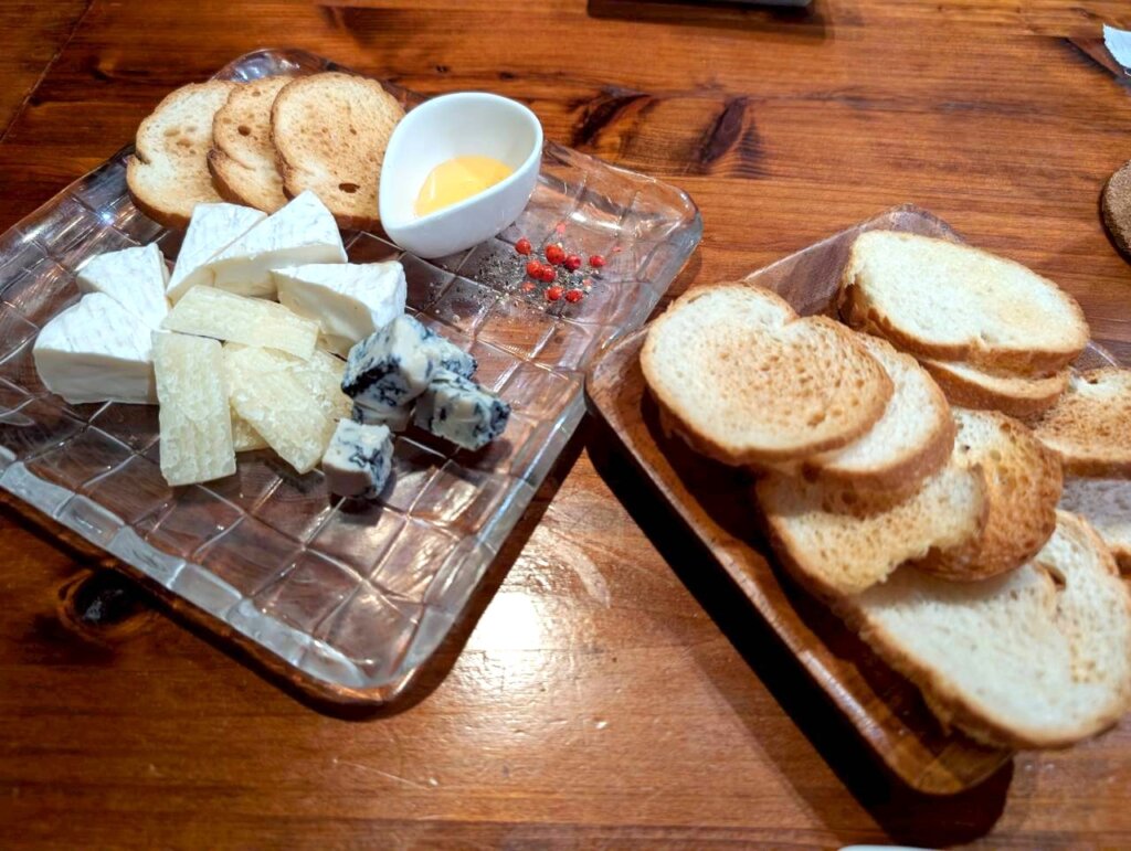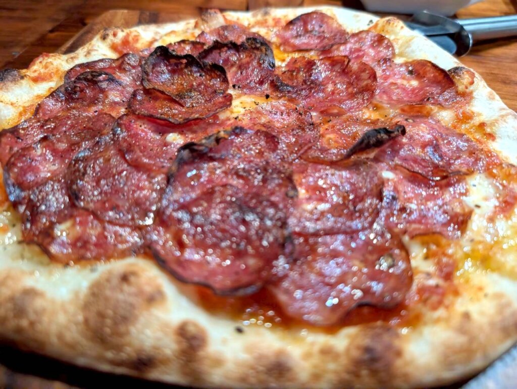 こちらは三種のチーズ盛り合わせと、イベリコサラミのピザです。三種のチーズはそれぞれ全く違う味わいで、ワインによく合います。イベリコサラミのピザは、サラミの脂と旨みがあふれ出しています。トッピングはサラミとチーズのみのシンプルな構成ですが、どちらもピザの味をワンランク押し上げる美味しさの為、大満足な一枚になっていました。