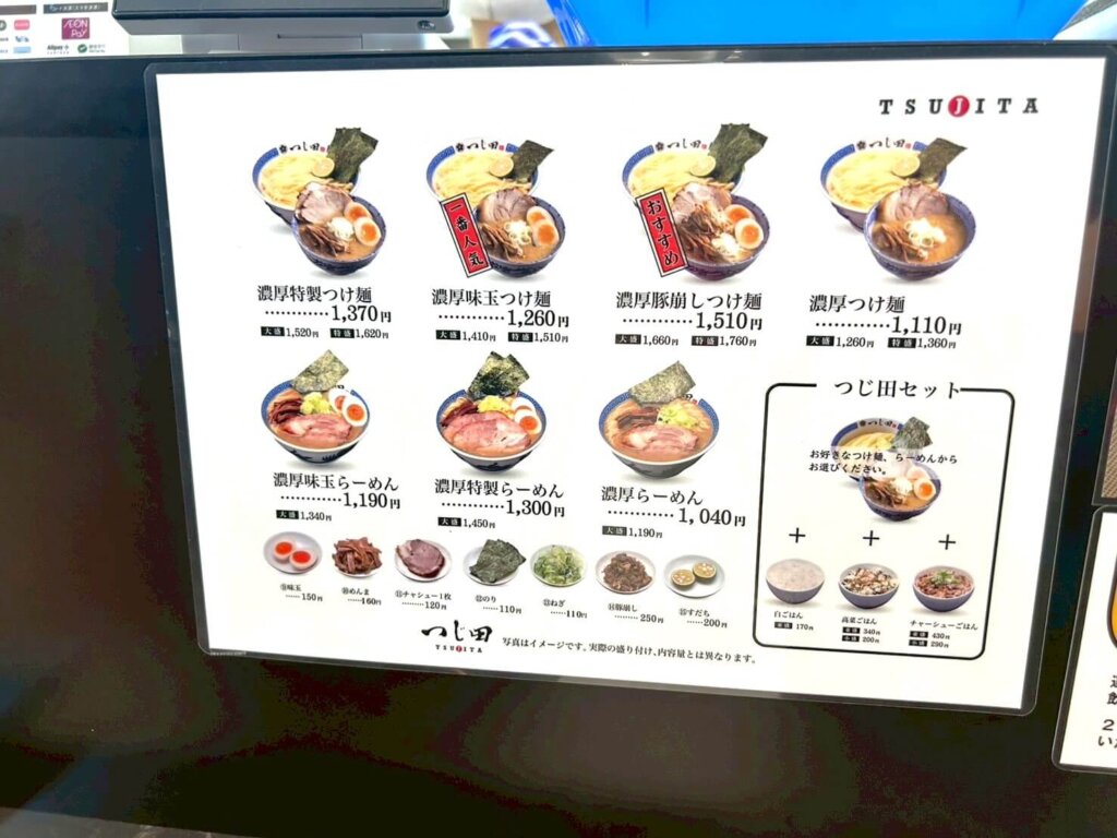 メニューは、主に濃厚らーめんとと濃厚つけ麺で構成されています。やはり、つけ麺が人気メニューのようです。らーめんorつけ麺、3種類の丼ものから1品を選ぶ「つじ田セット」というセットメニューも用意されていました。おすすめや一番人気は、メニュー上に記載されていて、初めてのお客様が注文しやすい仕様になっていました。