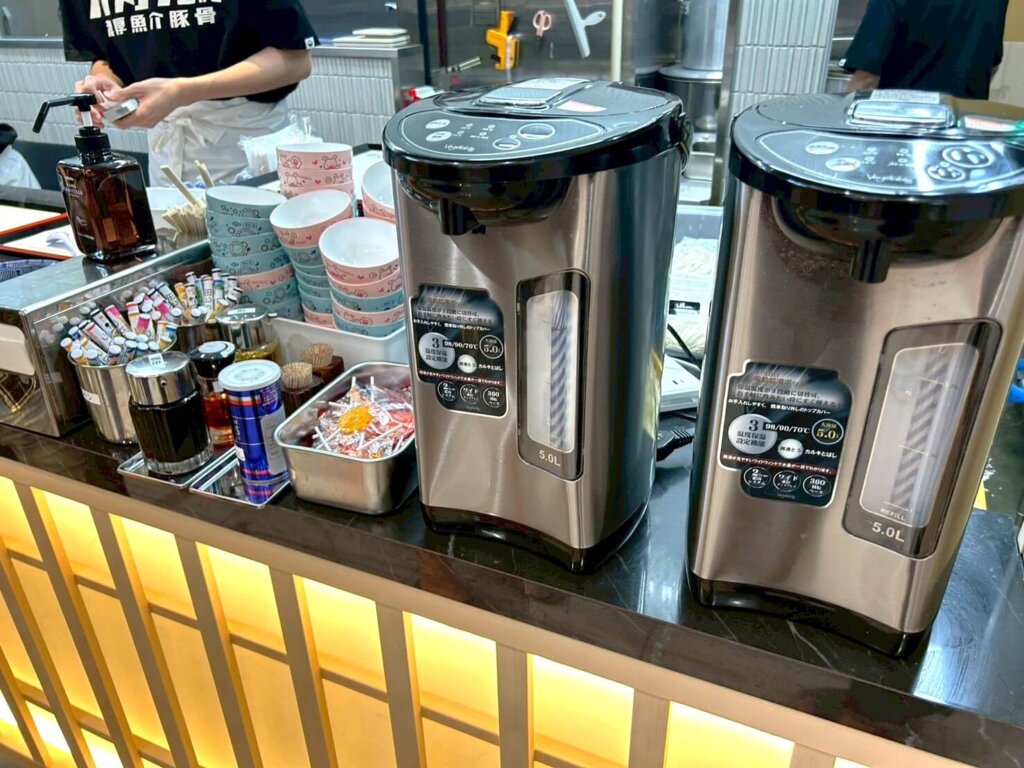フードコートなので、注文後番号札で呼ばれたら取りに行くスタイルです。その際に、つけ麺を注文した方には「醍醐味」という専用の調味料をいただくことが出来ます。スープ割やコショウなどの卓上調味料もここで入れることが可能です。お子様用の飴もサービスで置かれていました。