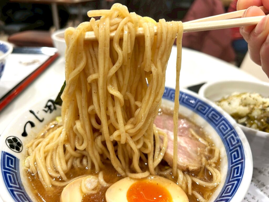 麺はストレートな細麺です。つけ麺とらーめんどちらも特注麺を使用していて、スープに最良の麺になっていました。しっかりと絡みつき最後まで満足感を味わうことができます。