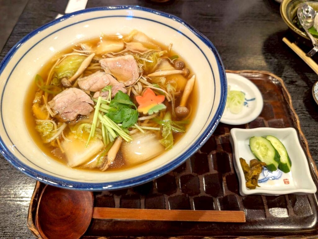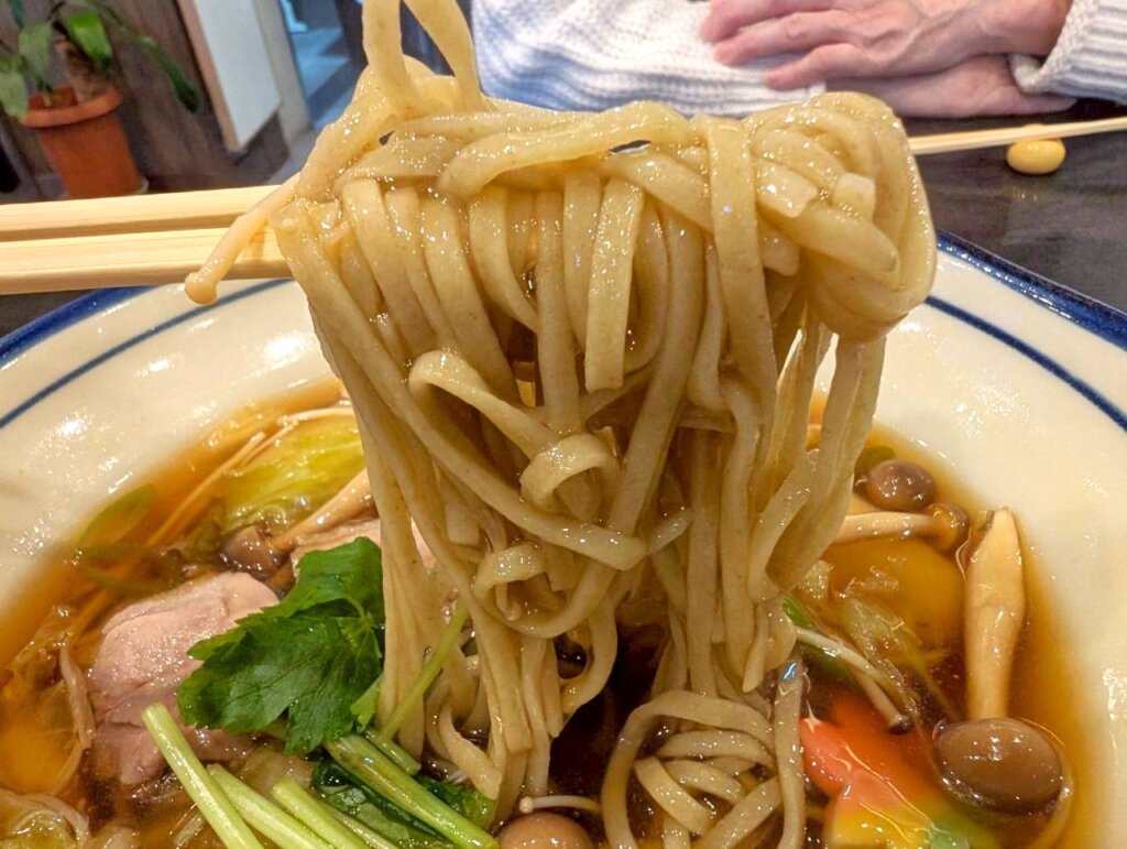 こちらが鴨と野菜のあんかけそばです。トロっとしたあんかけ・しっとりした鴨肉・シャキシャキの野菜・弾力のあるきのこなど、様々な食感を楽しめる一杯となっています。寒い冬にぴったりな、あったかメニューという印象でした。