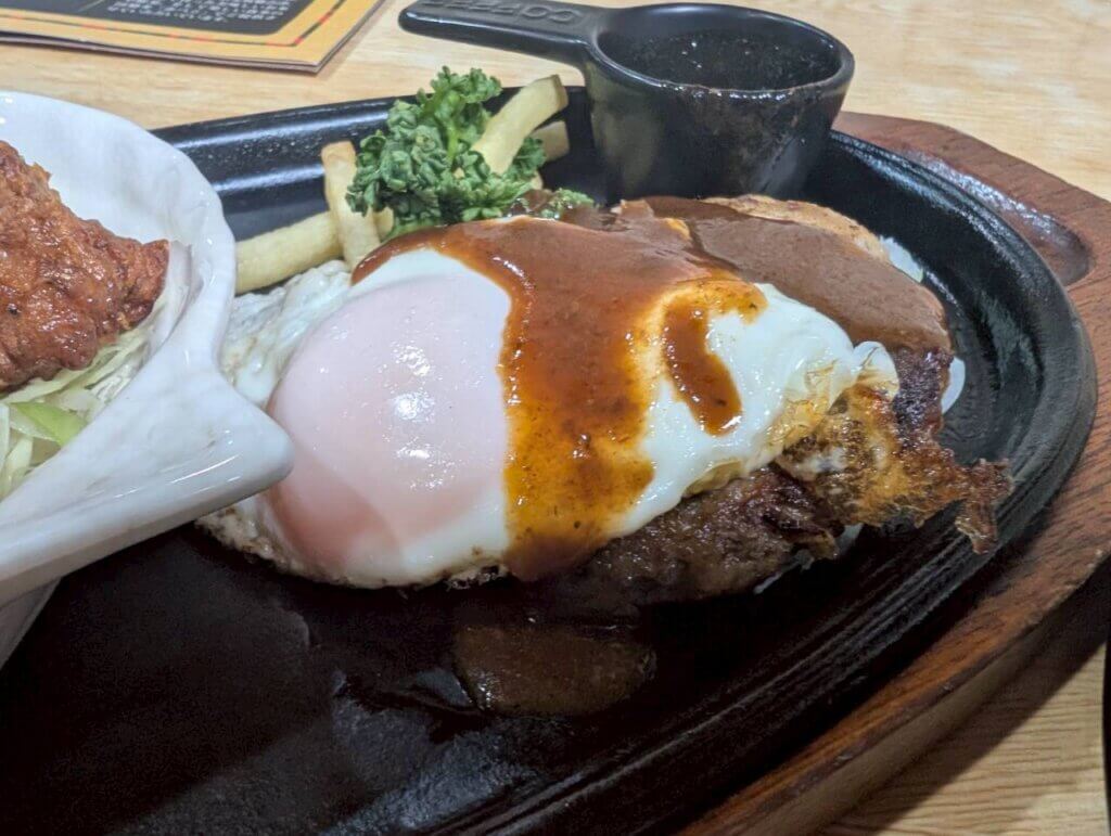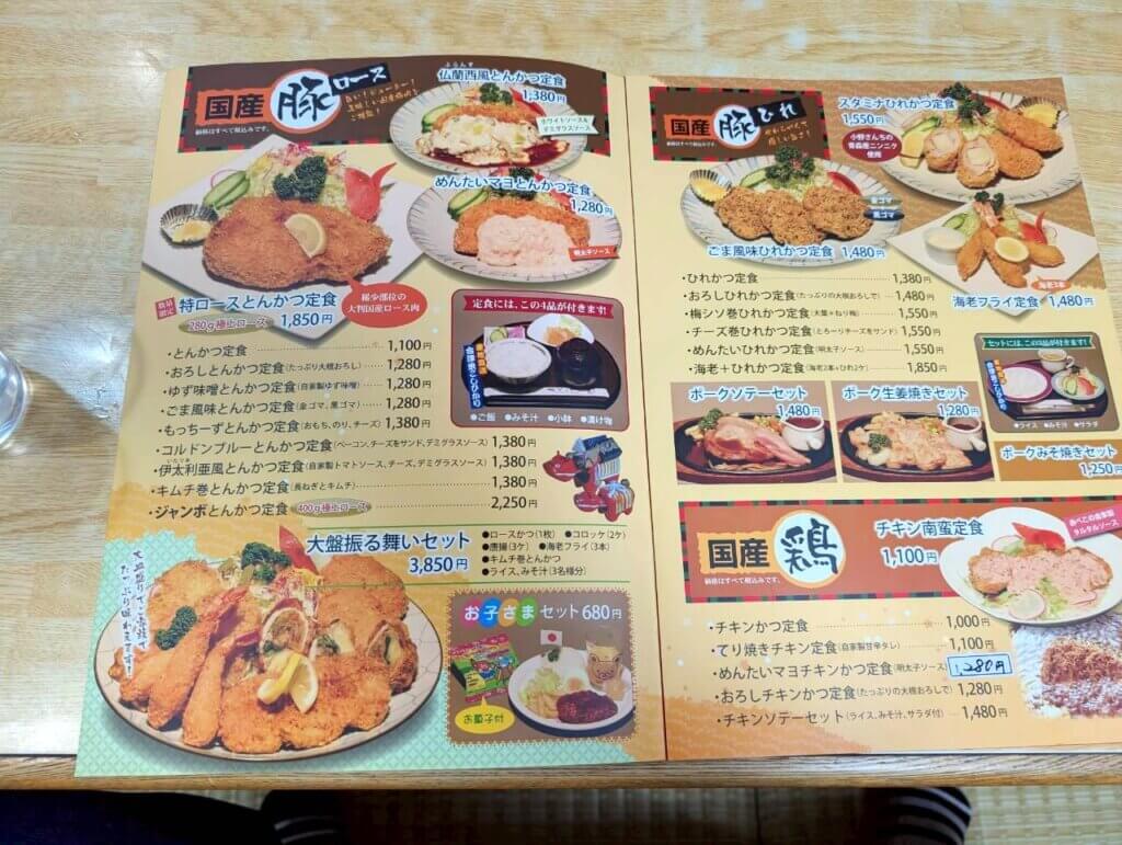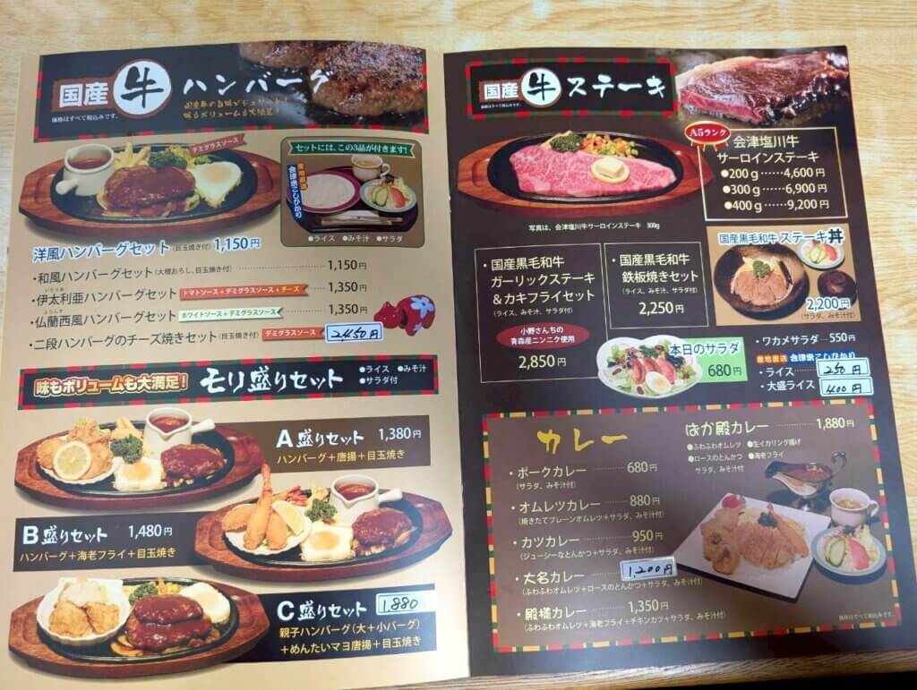 ハンバーグ・ステーキ・とんかつ・エビフライ・カレーなど、豊富なメニューが揃っています。1回で色々な料理を食べることが出来るモリ盛りセットや、大勢でシェアすることが出来る大盤振る舞いセットなど、セットメニューも充実していました。