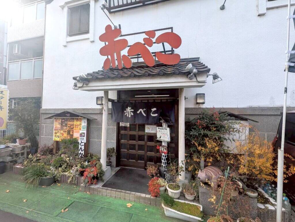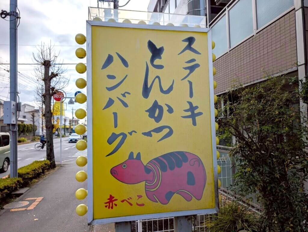 黄色の看板に、赤べこのイラストがトレードマークになっています。駐車場もあるので、車でのアクセスも可能です。