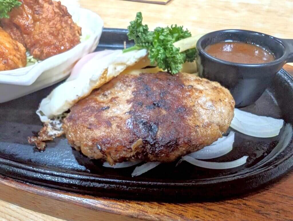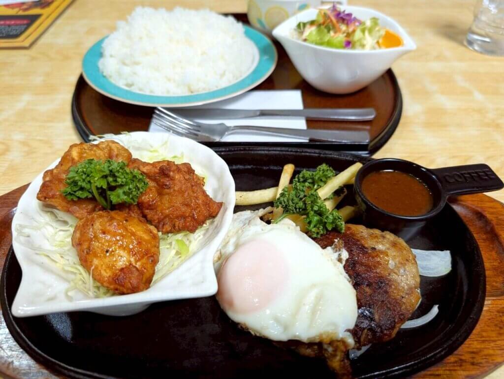 こちらが赤べこさんのA盛りセットです。ハンバーグにから揚げと、見るだけでワクワクするラインナップに、ライス・みそ汁・サラダがセットとなっています。ジューシーなハンバーグと、表面がサクサクに仕上がったから揚げは、とにかくご飯がすすむ一品でした。