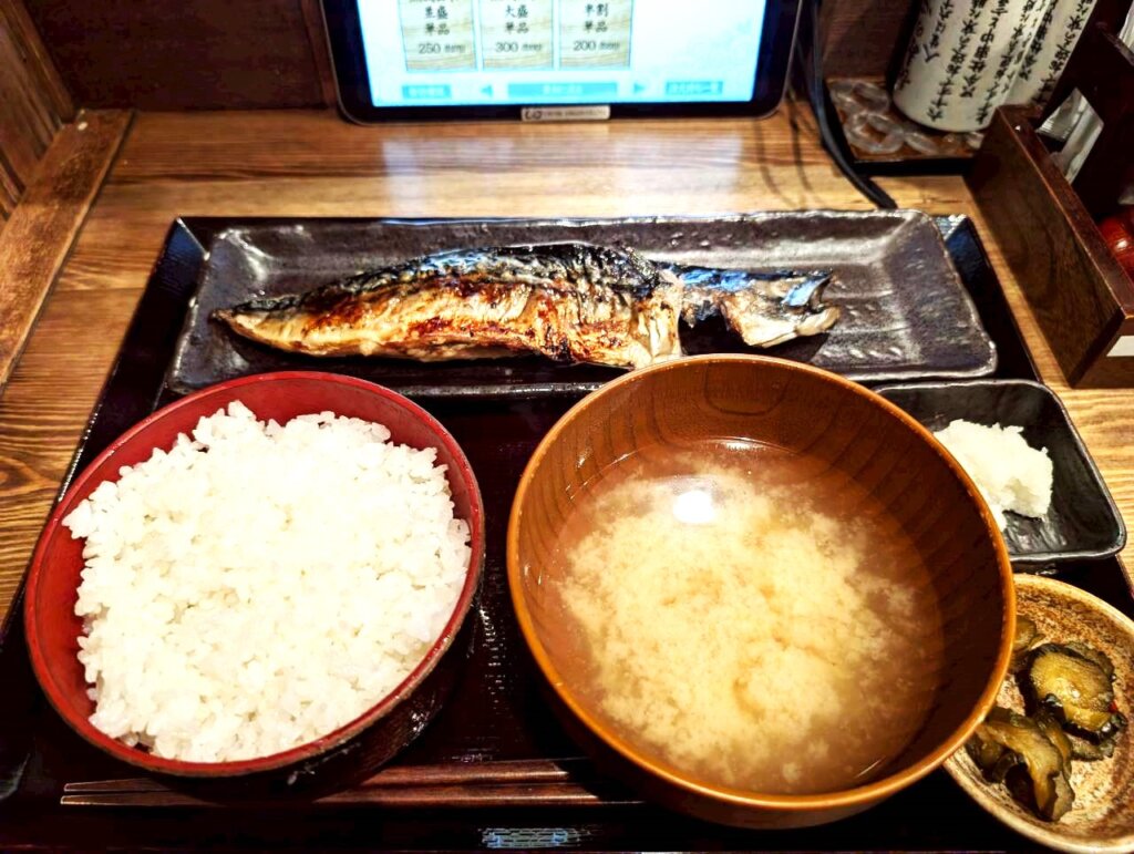 こちらが、しんぱち食堂さんのさば文化干し定食です。ごはん・味噌汁・メインのさば・漬物・大根おろしという、王道の定食スタイルとなっています。栄養のバランスが良さそうだなという印象を受けました。
