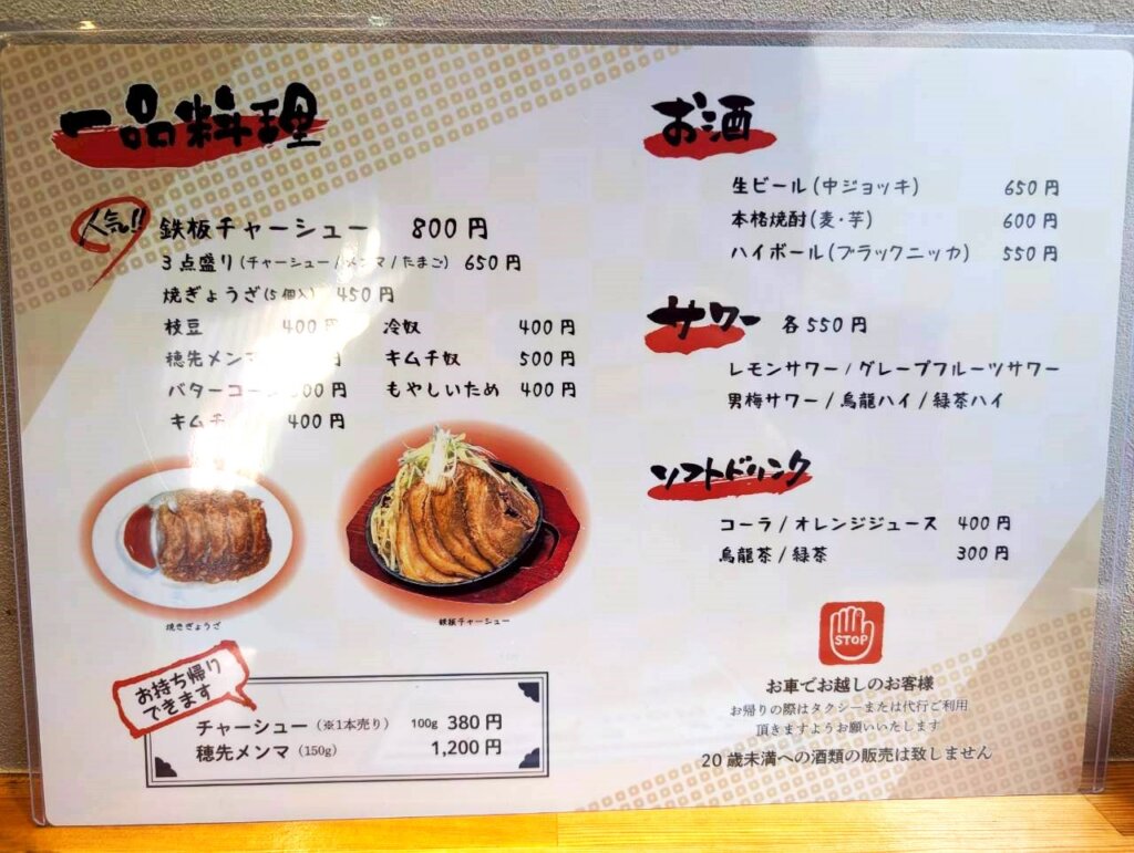 メニューは、ラーメンにつけ麺、一品料理などが用意されています。ドリンク類も豊富で、一品料理と合わせて居酒屋感覚で利用しているお客様もいらっしゃいました。