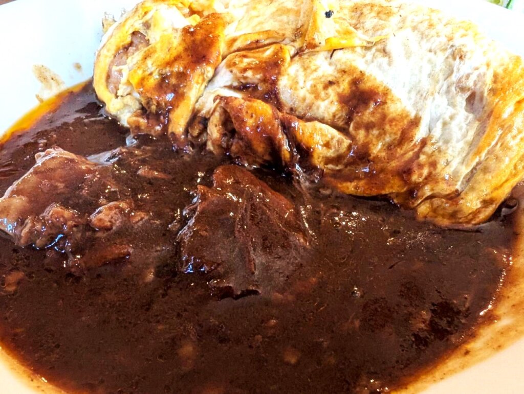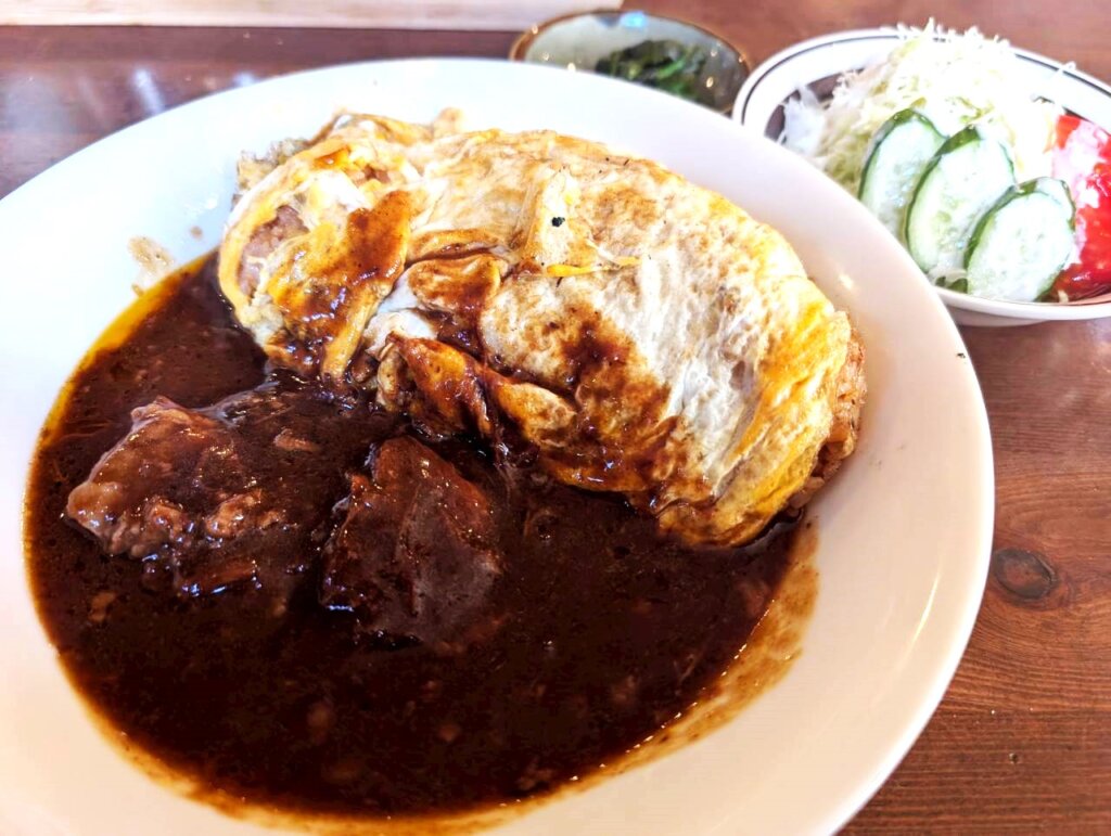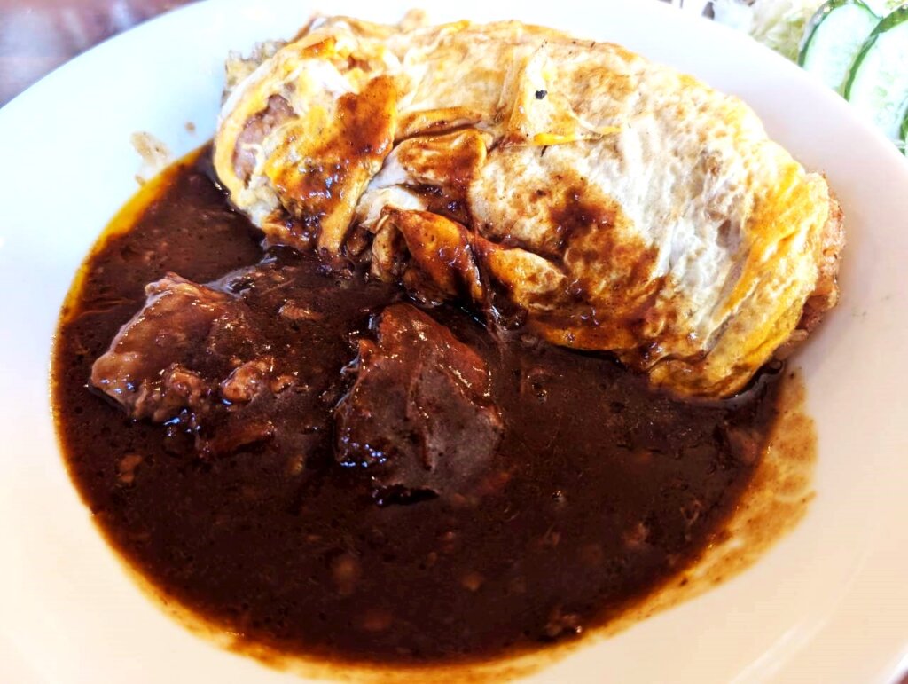 お肉がすごく柔らかいのも特徴です。仕込みにすごく時間をかけているのを感じます。上品な味のシチューとオムハヤシの甘味が合わさり、濃厚でまろやかな優しい味わいを楽しむことが出来ます。
