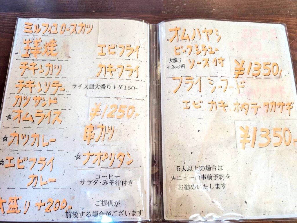 メニューは、肉料理・揚げ物・カレー・パスタ・カツサンド・オムライスなど、豊富な種類が用意されていました。すべてのメニューに、コーヒー・サラダ・みそ汁が付いてきます。まさに、至れり尽くせりです。