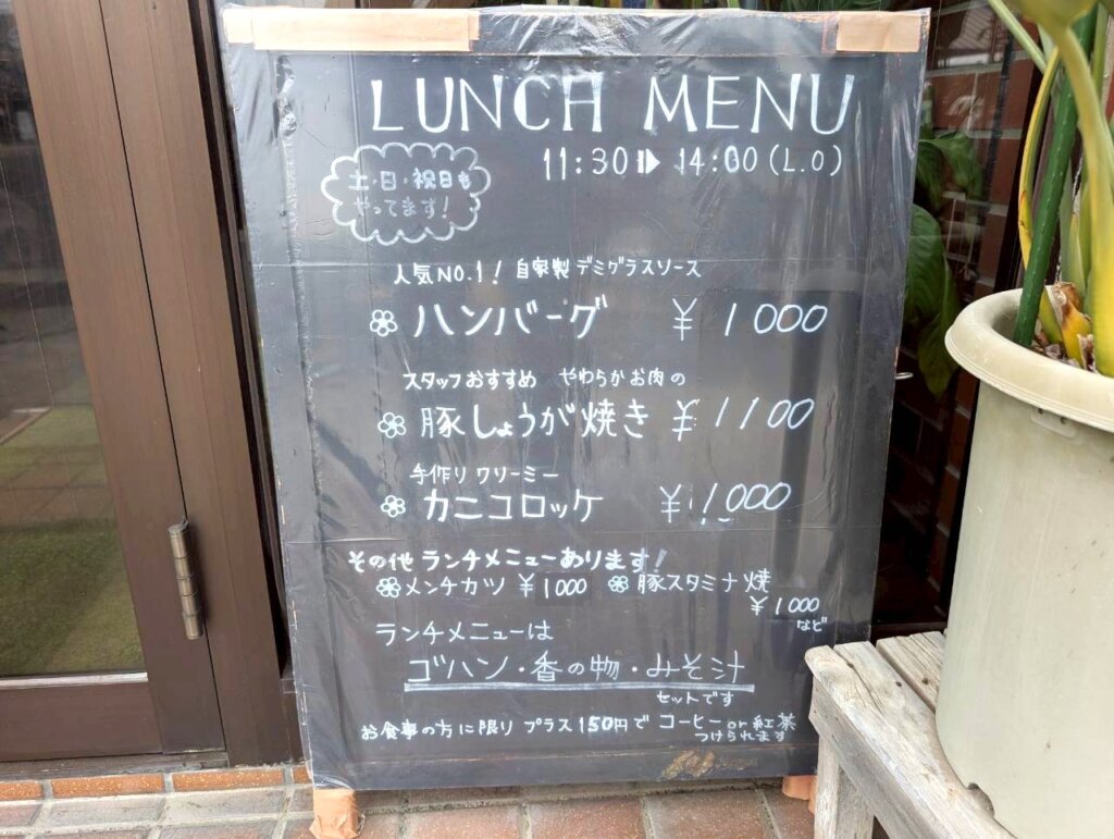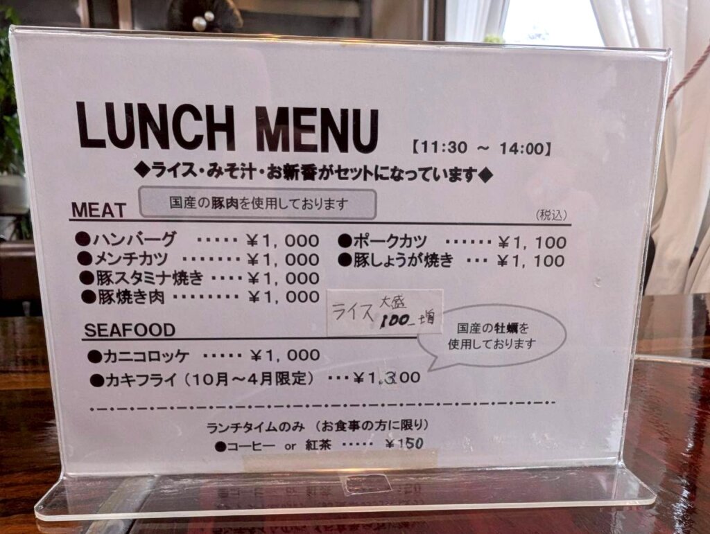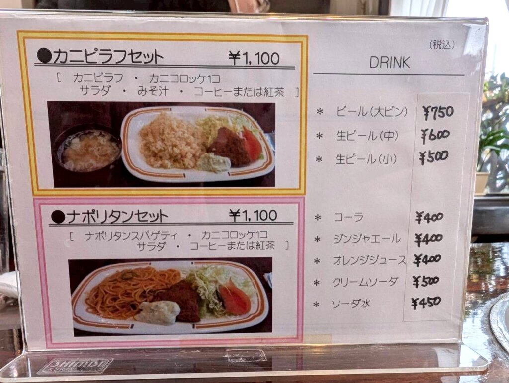 ランチメニューは、ライス・みそ汁・お新香がセットになっています。お肉を使った料理を中心に、焼き物・揚げ物など、種類が豊富でした。カニピラフやナポリタンなども用意されていて、その日の気分にあわせて注文することが可能です。