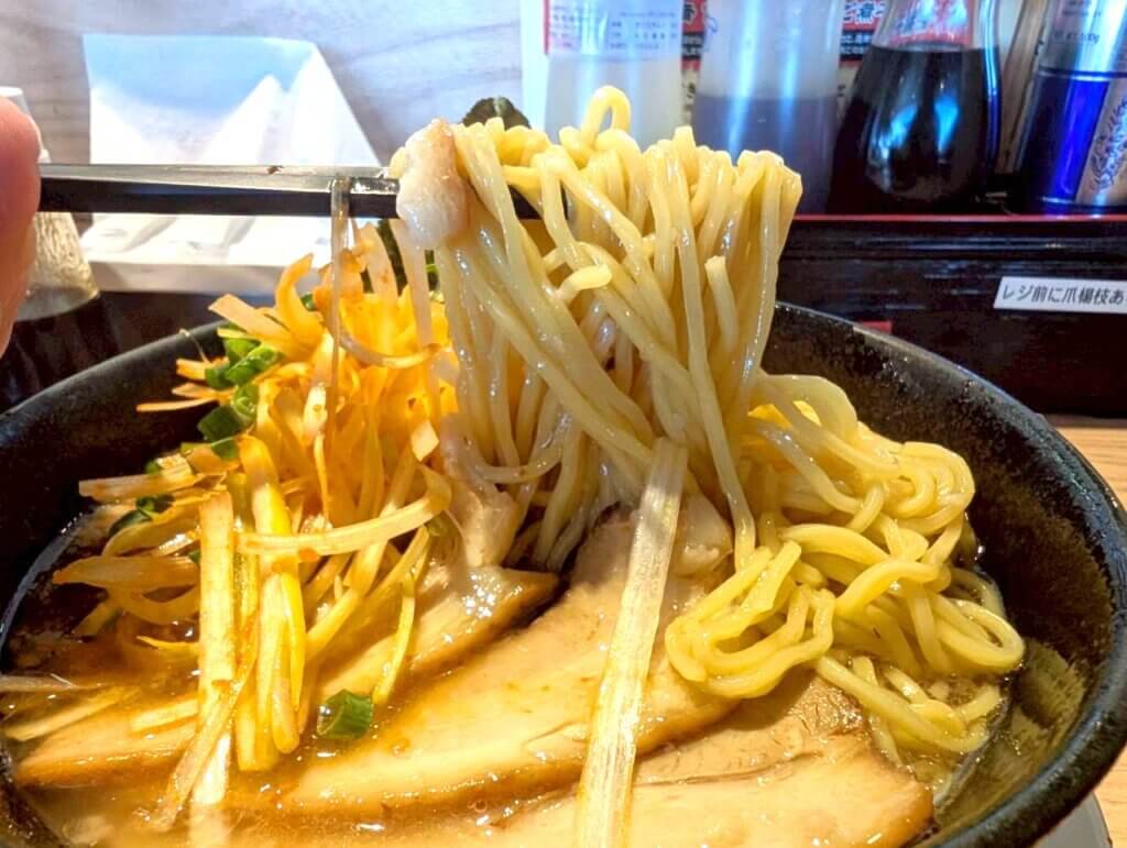 濃厚な醤油スープともっちり麺は相性抜群。食べ進めていく中で、スープと麺に辛味が浸透し、違った味わいをもたらします。トロトロのちゃーしゅー・しゃきしゃきの白髪ねぎと、様々な食感が楽しめるのも特徴。最後までいろいろな味・食感を楽しめるので、飽きることなく食べ進めることが出来ます。