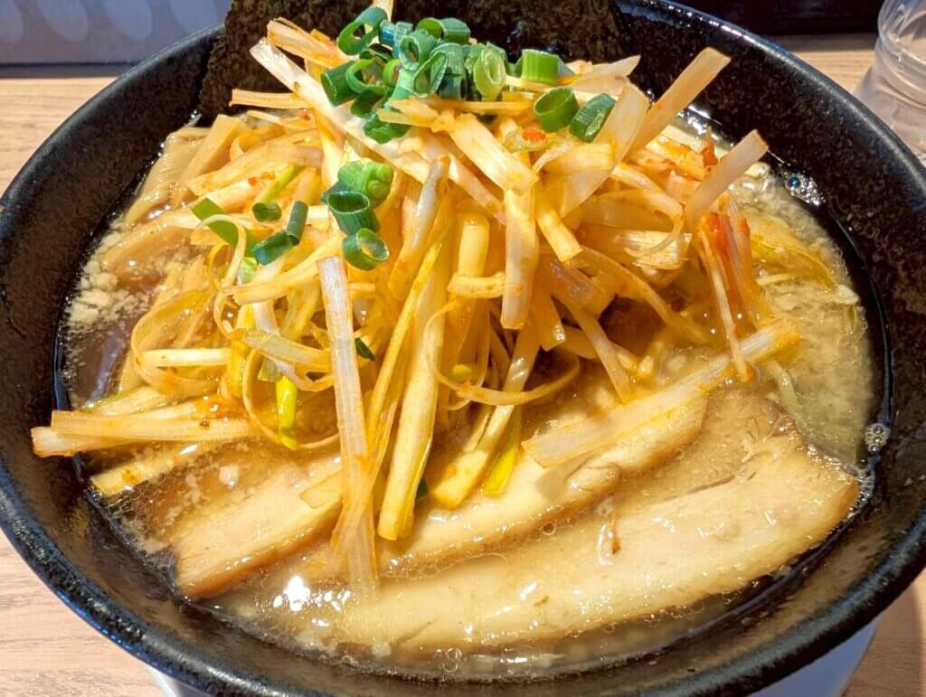 こちらが、川崎屋さんの辛ねぎ醤油ちゃーしゅーです。ピリ辛の白髪ねぎにチャーシューという王道トッピング。背脂の調整も可能です。絶妙な辛みと濃厚なスープがクセになる一杯となっています。
