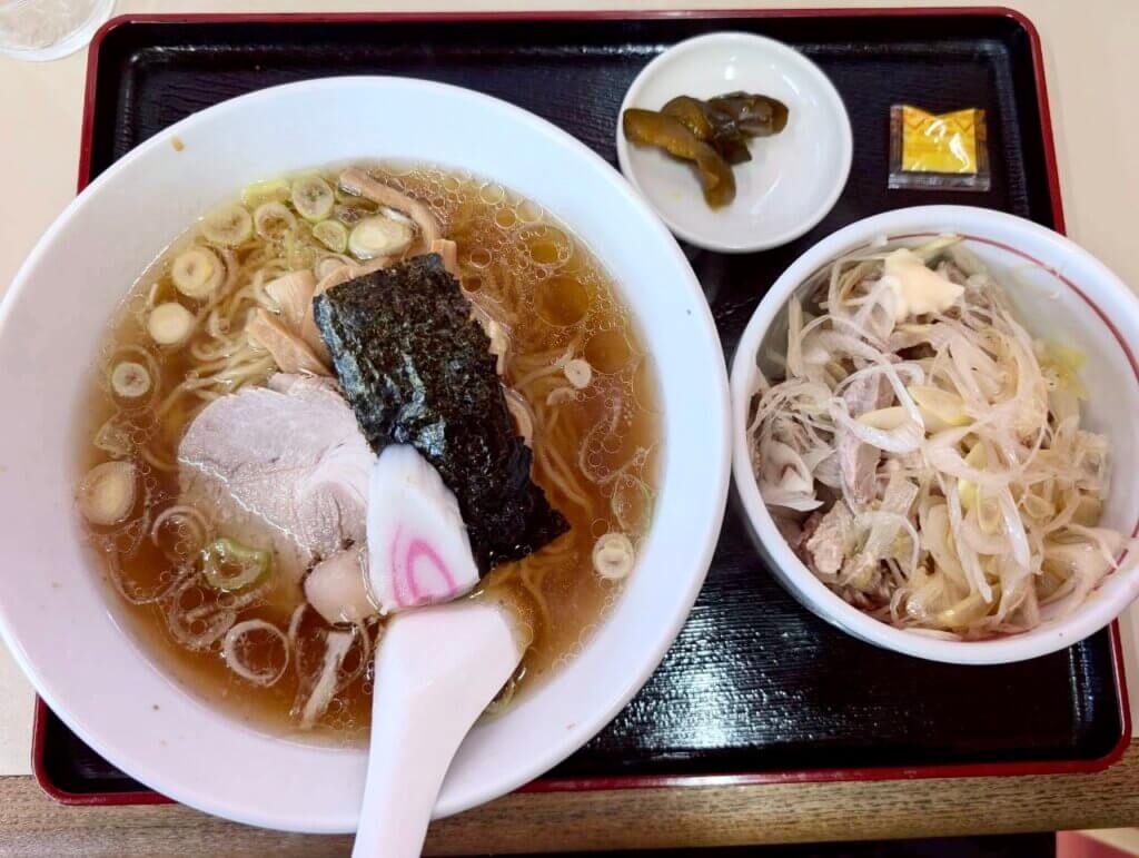 サービスメニューのラーメンとネギチャーシュー丼を頂きます。